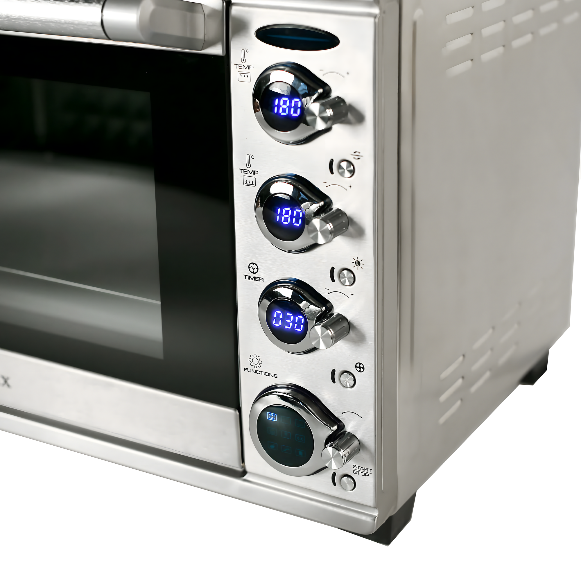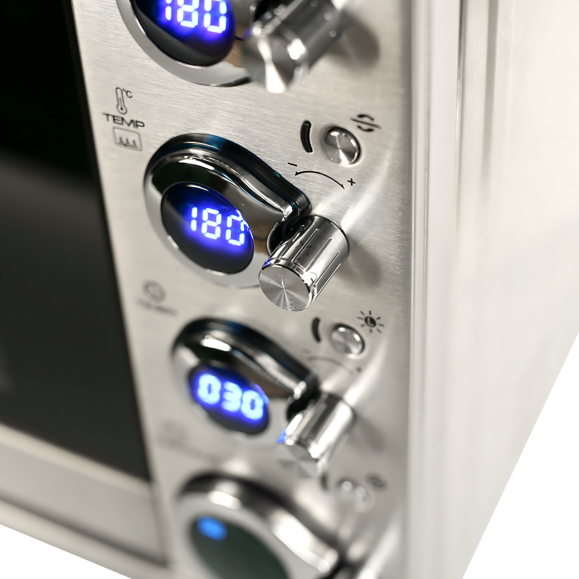 Выбор верхней температуры, выбор нижней. Таймер. Подсветка. Функция реальной температуры в печи. Очень удобное и понятное управление. Наглядность. В общем прибор придающий уверенность.