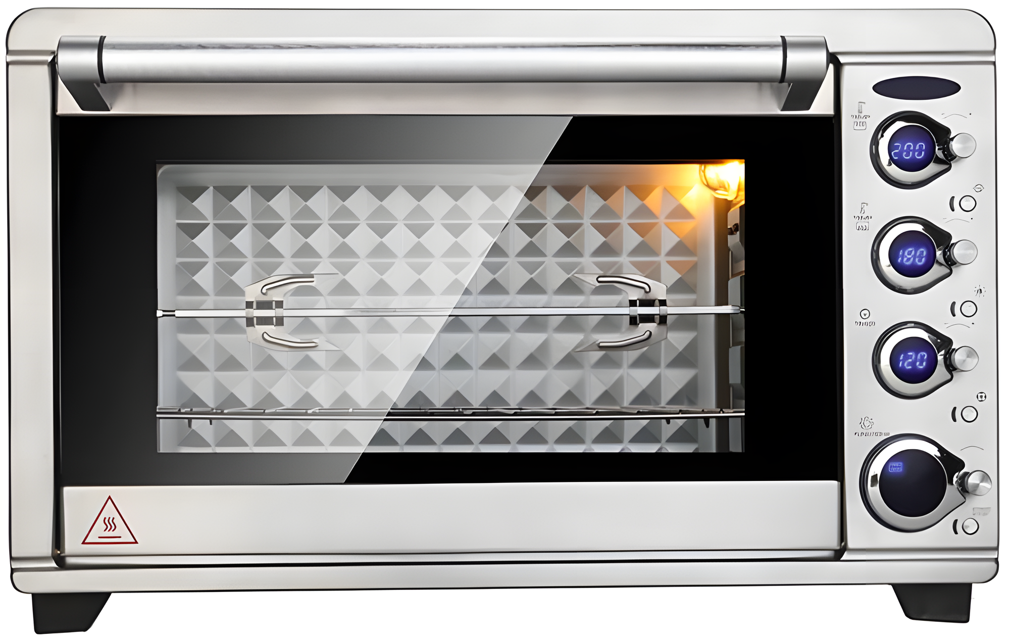 Равномерно пропекает, уже пробовали в ней печь бисквит, курицу-гриль на вертеле, свинину по-французски, все просто идеально, и что нам понравилось, это то, что нагревательные элементы в форме буквы М, что обеспечивает равномерный прогрев, моется очень легко