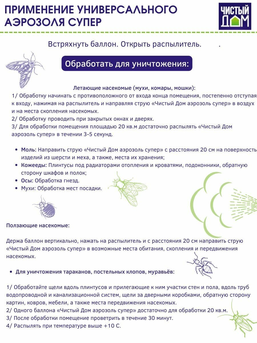 Средство от моли, комаров, муравьев, ос и шершней, тараканов, мух, мошек, кожееда, постельных клопов Аэрозоль Супер Универсальный 400 мл, Чистый дом