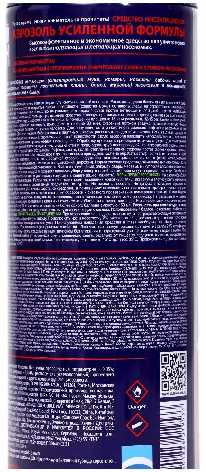 (2 шт.) Аэрозоль Чистый Дом 400мл., трубочка (от летающ. и ползающ.) б/запаха 02-855 (дихлофос) Китай