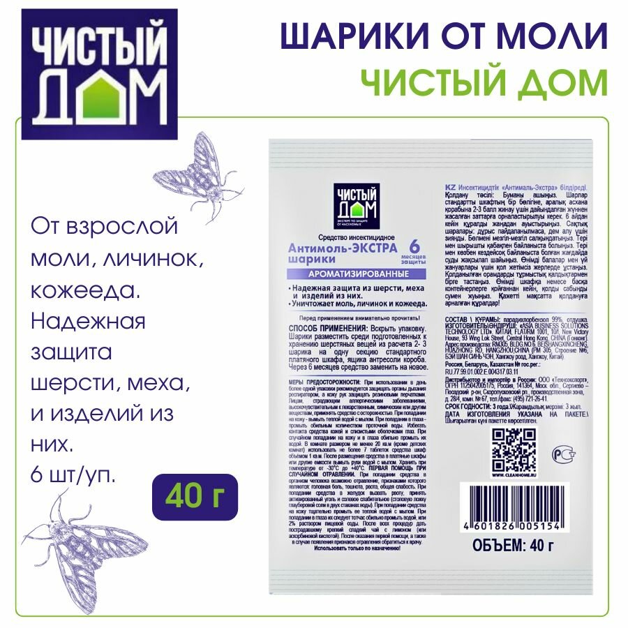 Шарики от моли "Чистый дом" Антимоль Экстра, пакет, 40 г(2 шт.)