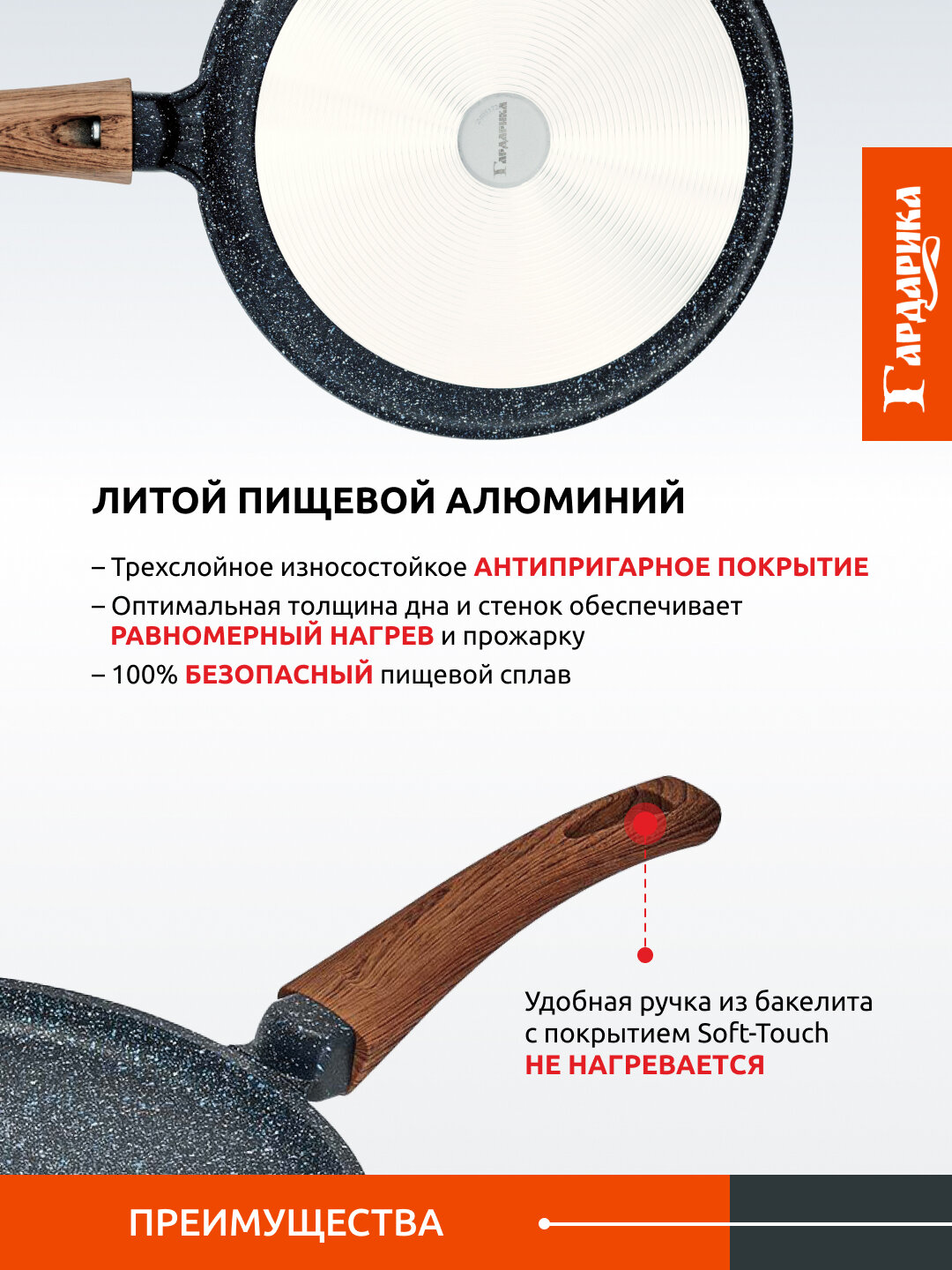 Блинница алюминий, 22 см, антипригарное покрытие, Гардарика, Мегалит 18, 0822-18, бакелитовая ручка, ручка soft-touch