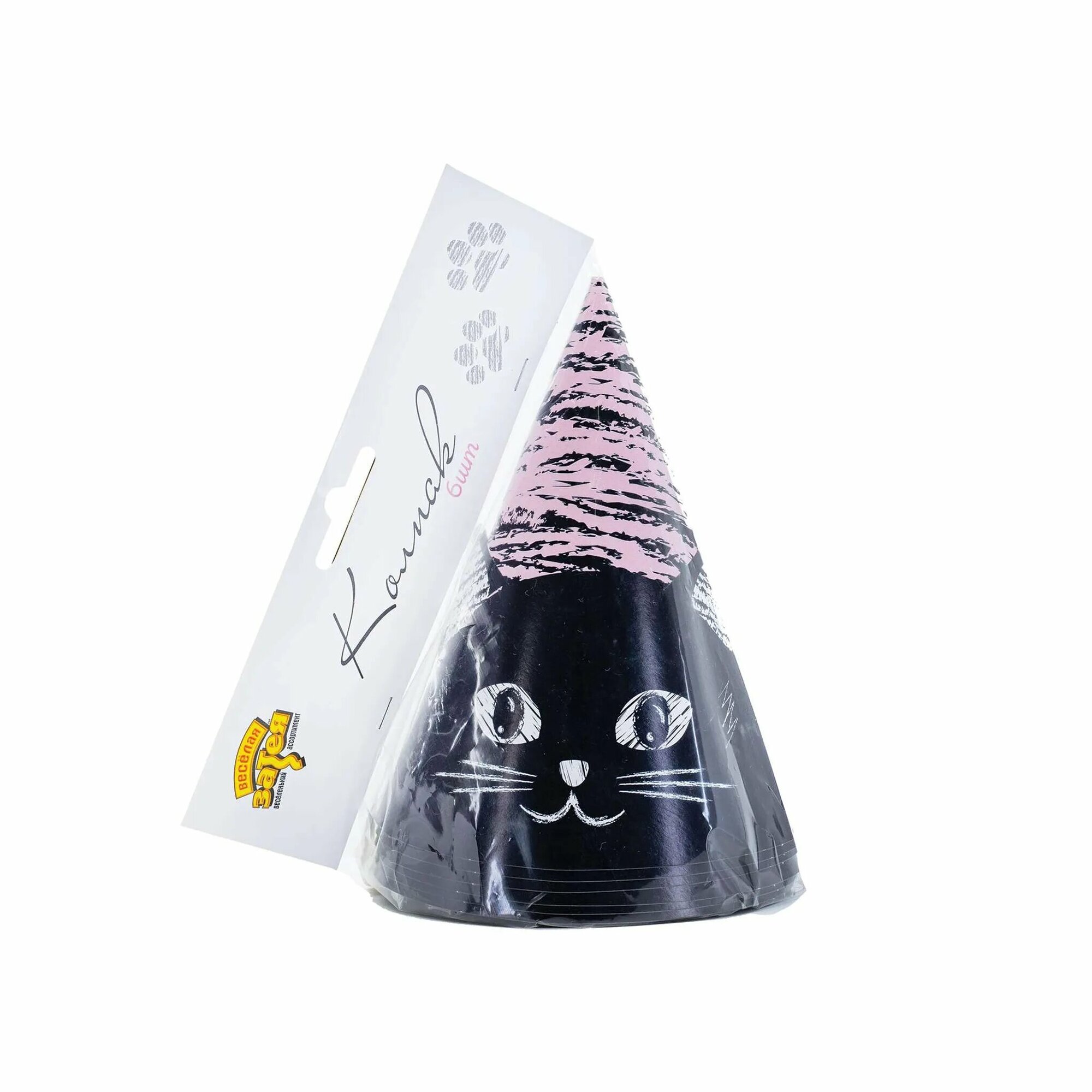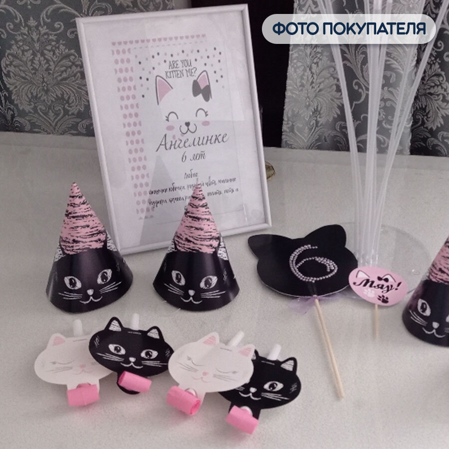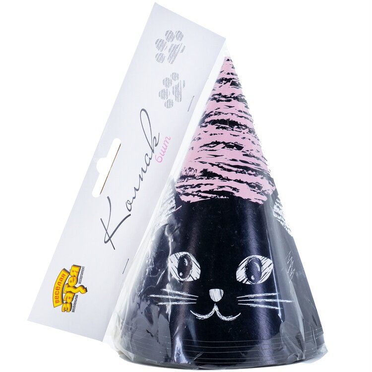 Праздничные колпаки картонные/бумажные Riota на день рождения Котики, черный, 6 шт.