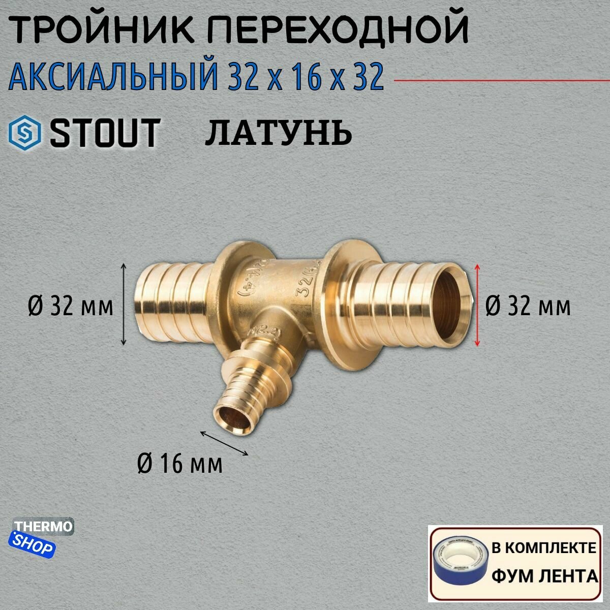 Купить Тройник STOUT 32х16x32мм, переходной, для сшитого полиэтилена, латунь, арт.SFA-0014-321632