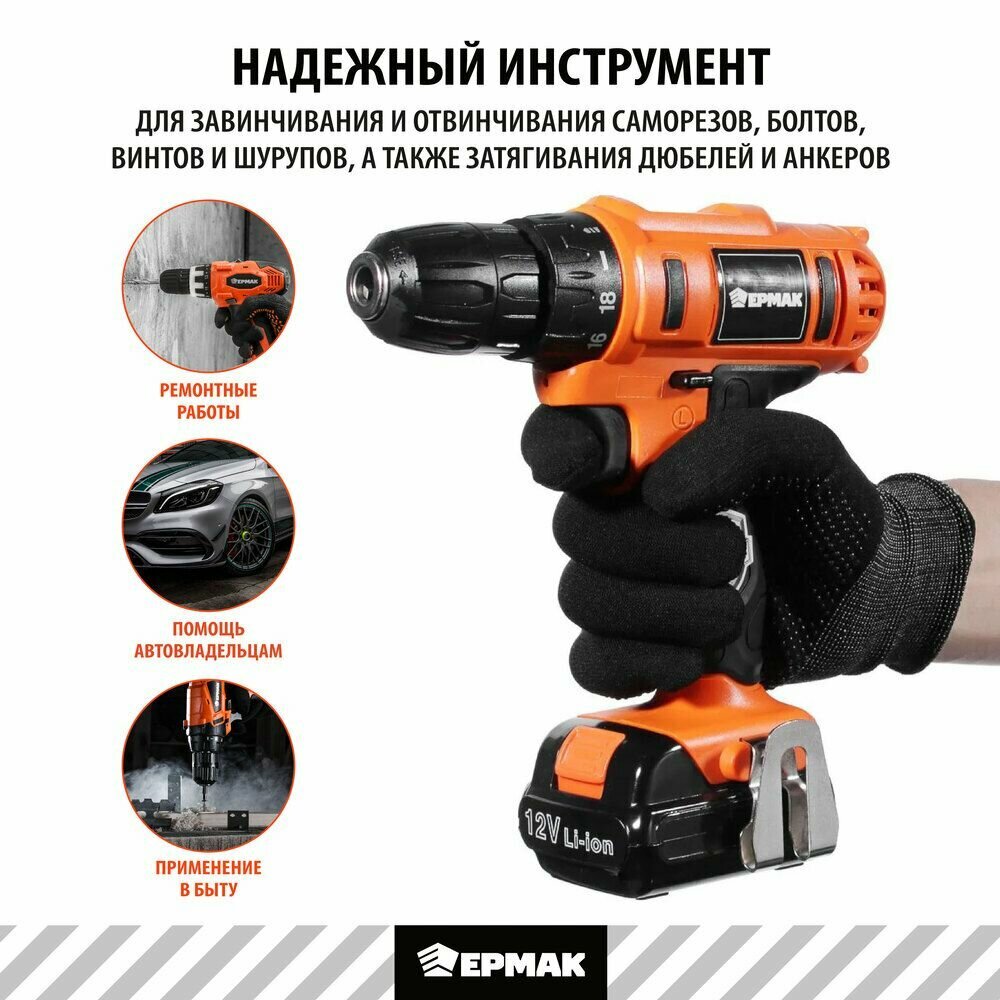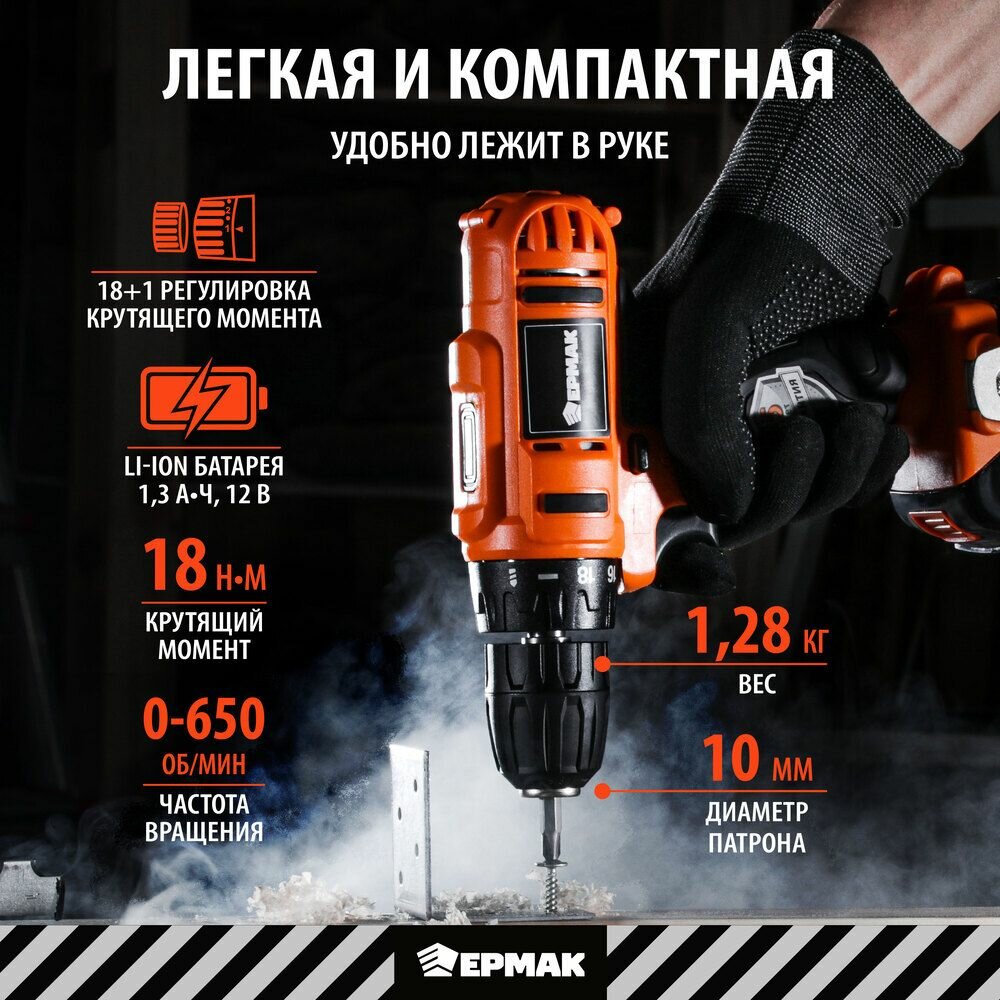 Ермак Дрель-шуруповерт, аккумуляторная ДША-12В /1,3Ач/Li-Ion/ 18 Н*м/18+1 скор/1аккум/коробка