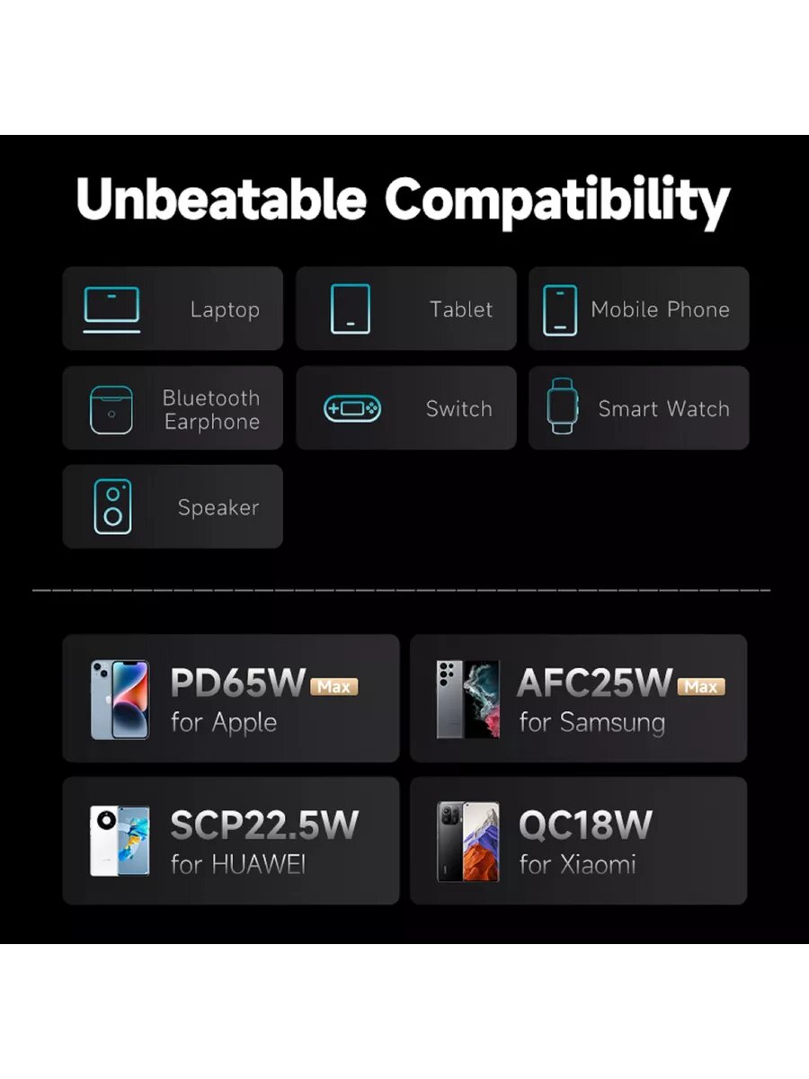 | Минусы: | При зарядке нескольких устройств одновременно быстрая зарядка не работает, нет блока питания для зарядки аккумулятора. |