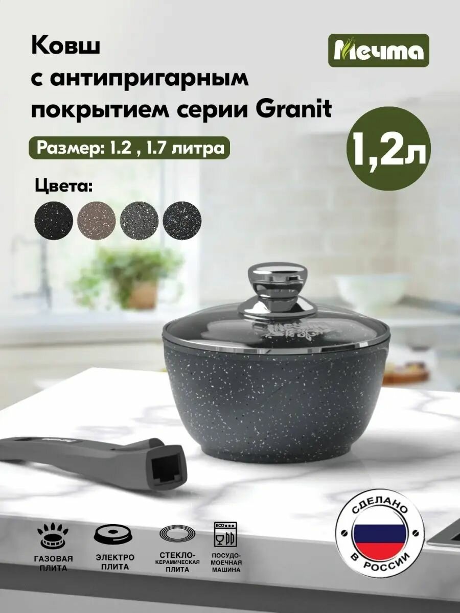 Ковш Мечта 1.2 л Гранит с антипригарным покрытием со съемной ручкой и крышкой, НЕ индукционная