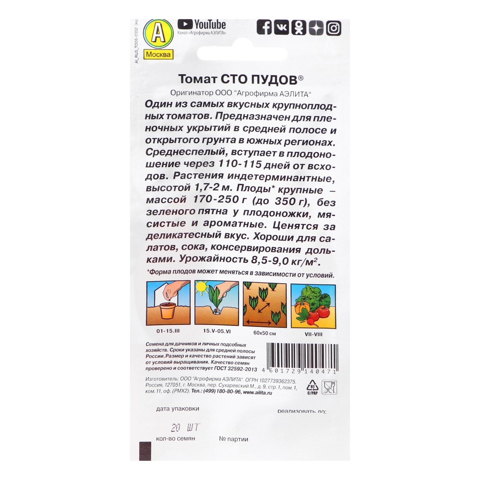 Семена Томат "Сто пудов", 20 шт (1шт.) интересное: