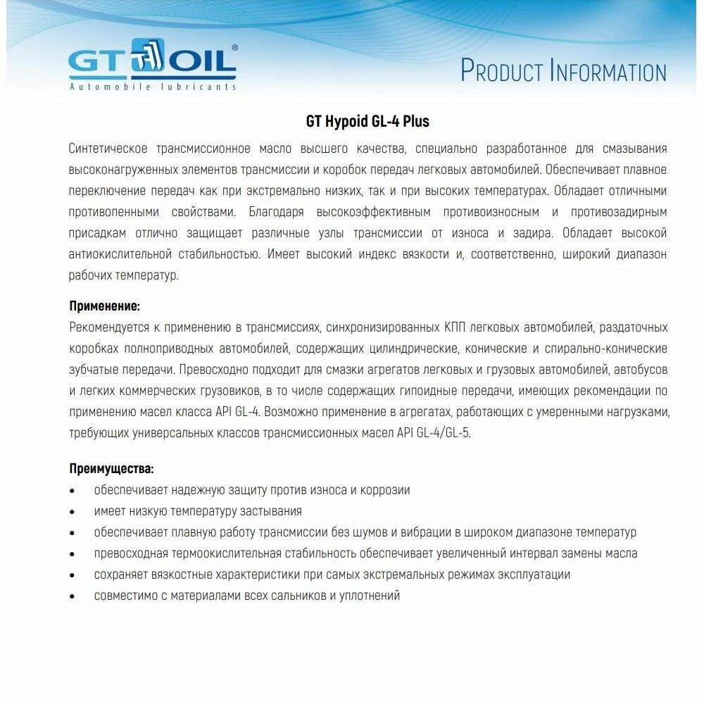 Масло GT Hypoid GL-4 Plus, SAE 75W-90, API GL-4/GL-5, 4 л, шт