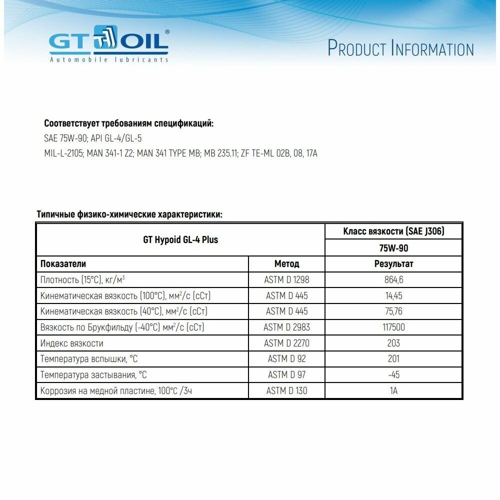 GT OIL Масло Hypoid GL-4 Plus, SAE 75W-90, API GL-4/GL-5, 4л 8809059407998