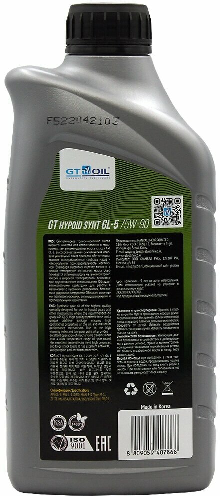 Масло Трансмиссионное Gt Hypoid Synt, Sae 75w-90, Api Gl-5, 1 Л GT OIL арт. 8809059407868