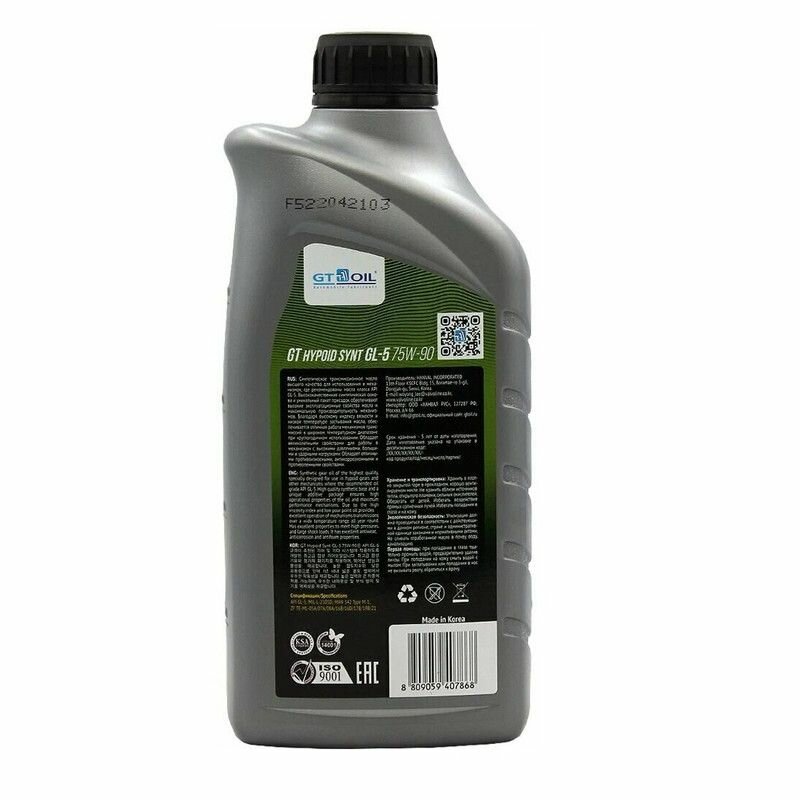 GT OIL Масло Hypoid Synt, SAE 75W-90, API Gl-5, 1л 8809059407868 .