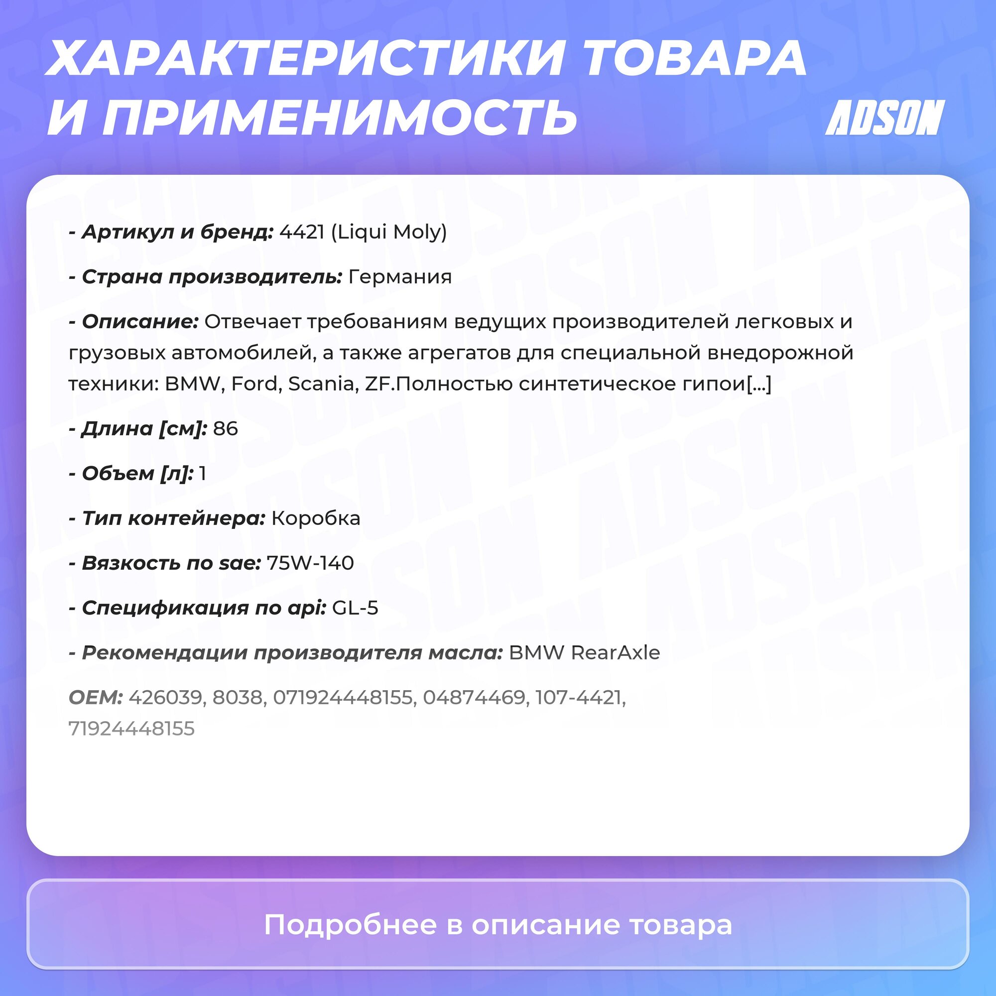 Liquimoly 75w140 vollsynthetisches hypoid-getriebeoil (1l)_масло трансмис.!синт\api gl 5 ls:bmw,ford liqui moly 4421