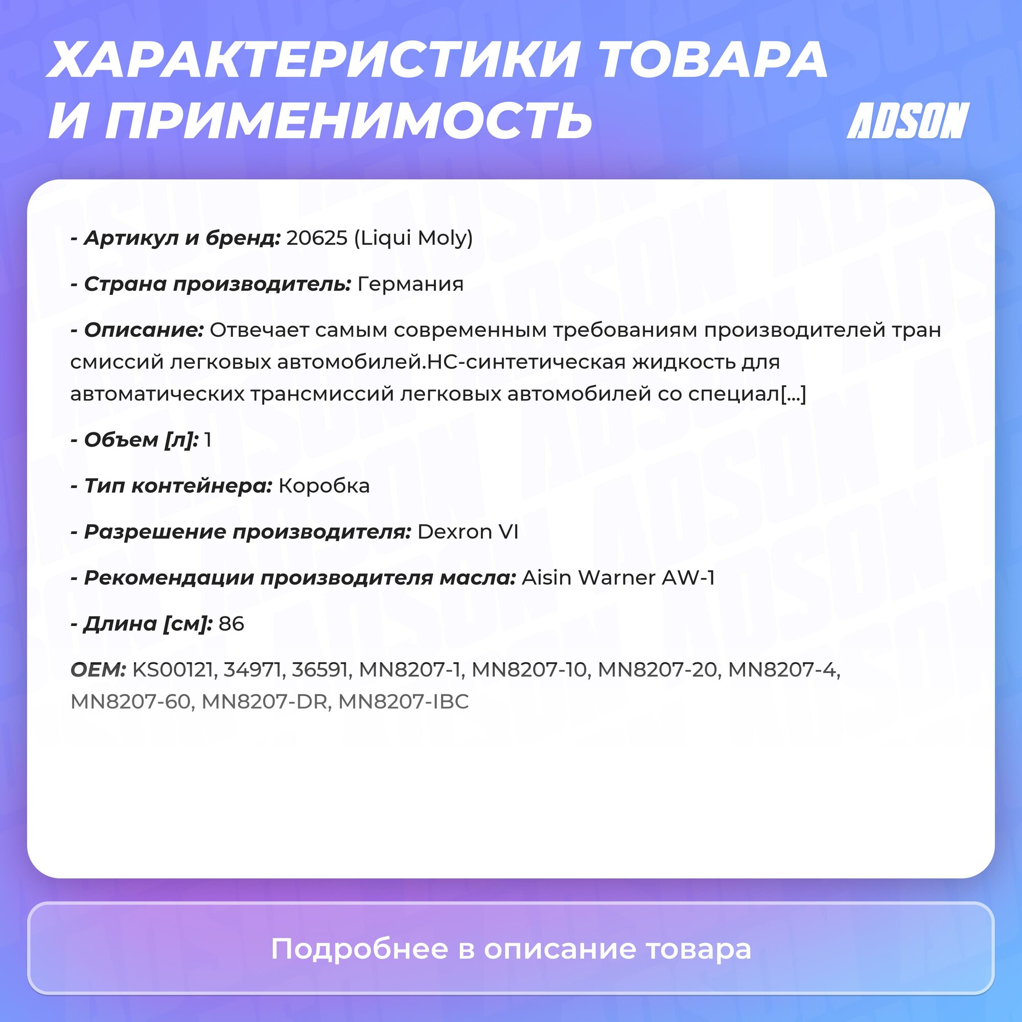 Сохранитьliquimoly top tec atf 1800 r (1l) жидкость гидравлическая! синт. для акпп\ dexron vi, mercon lv интересное: