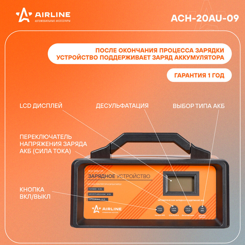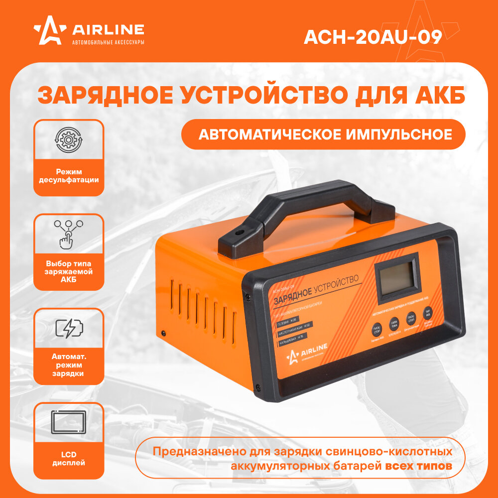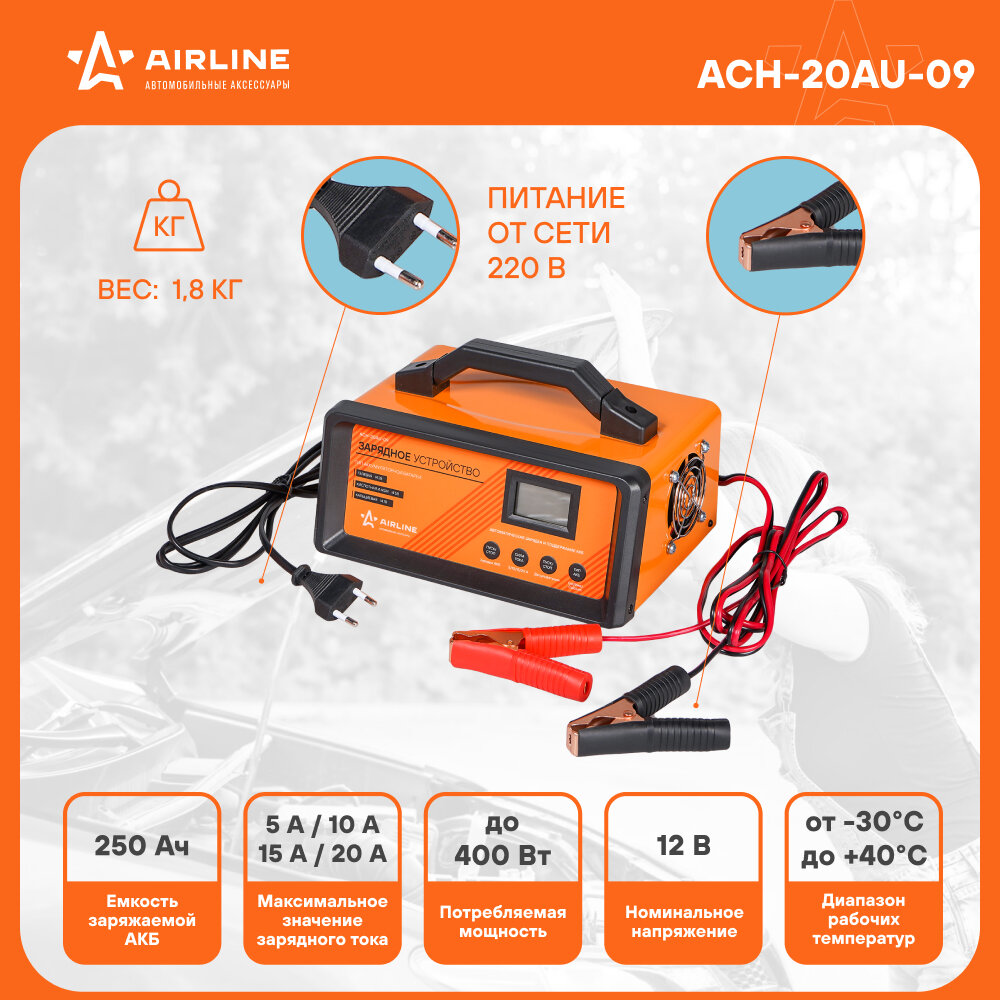 AIRLINE ACH-20AU-09 Зарядное устройство 5/10/15/20А 12В, автоматическое LCD дисплей, импульсное (ACH-20AU-09) 1шт