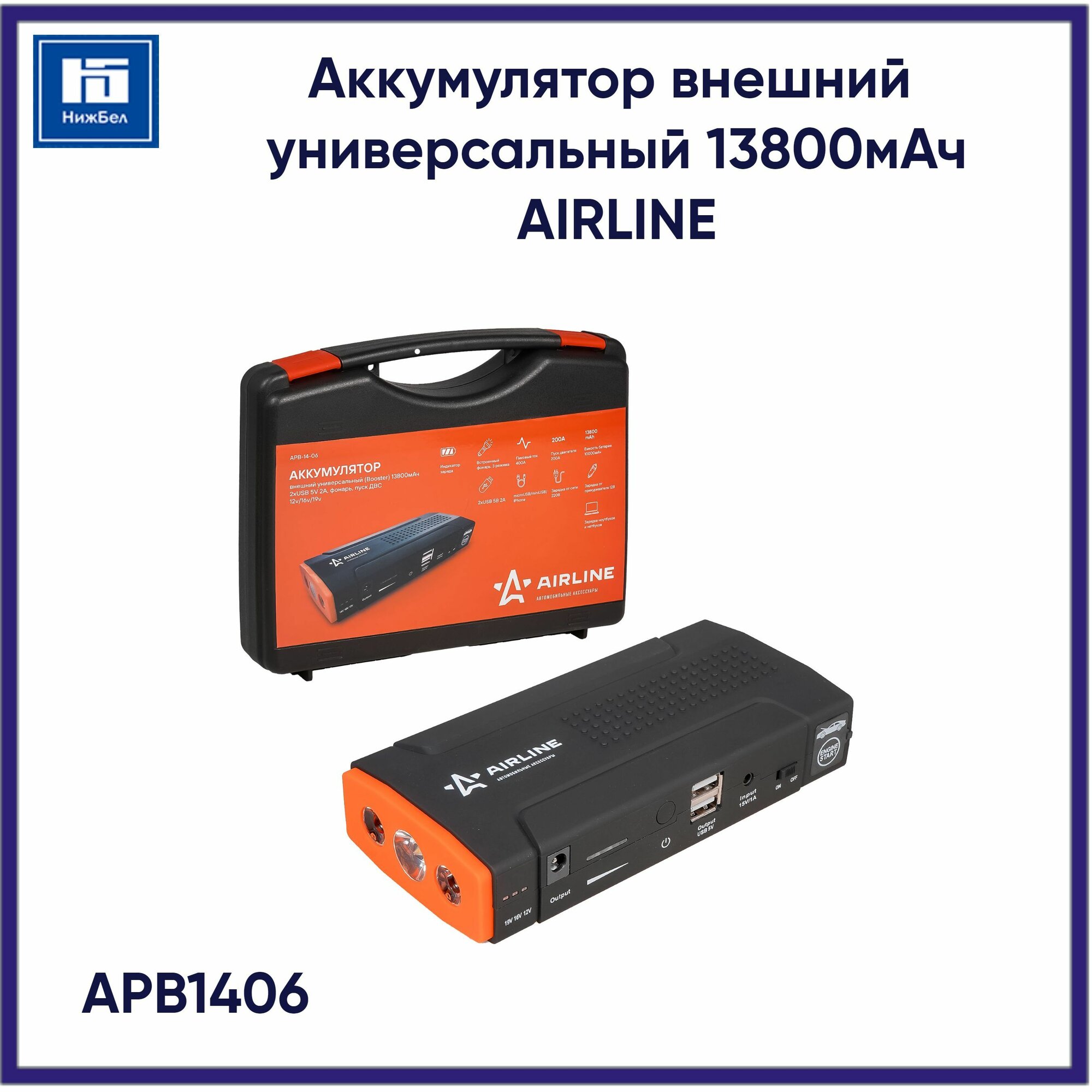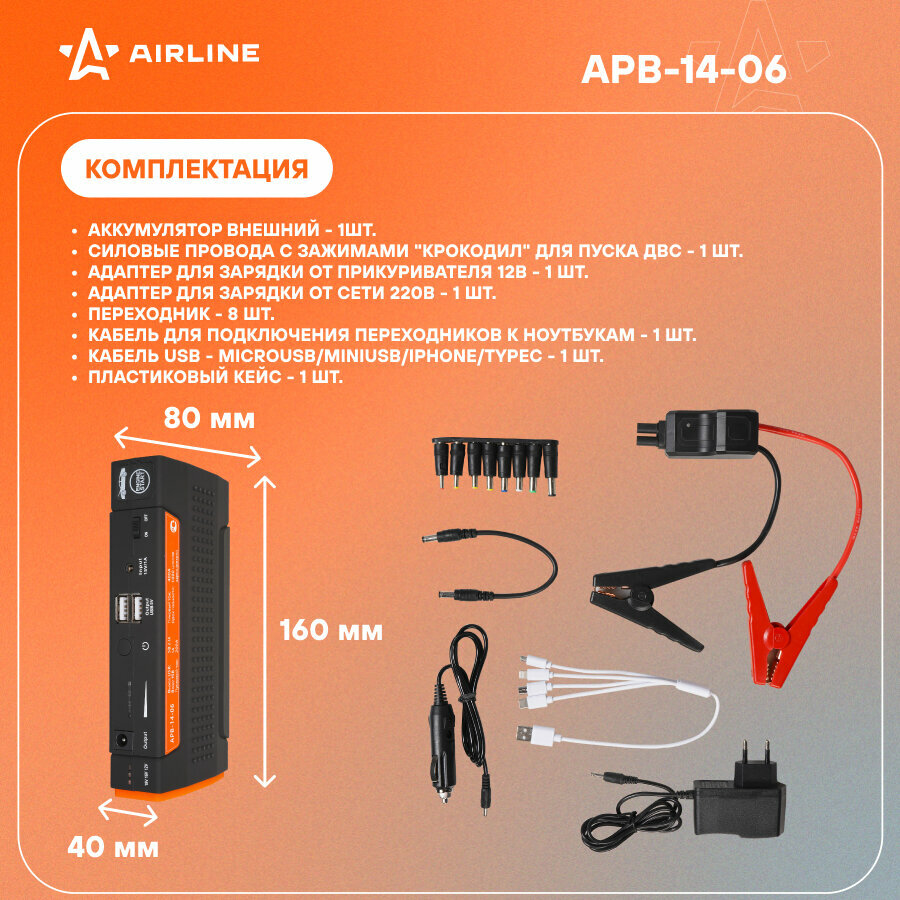 Купить Аккумулятор пусковой (Booster) 13800мАч, 400А, 12.4V, пуск ДВС 2.0d, USB 5V/2A, 12/16/19V, кейс (APB-14-06) APB-14-06 AIRLINE