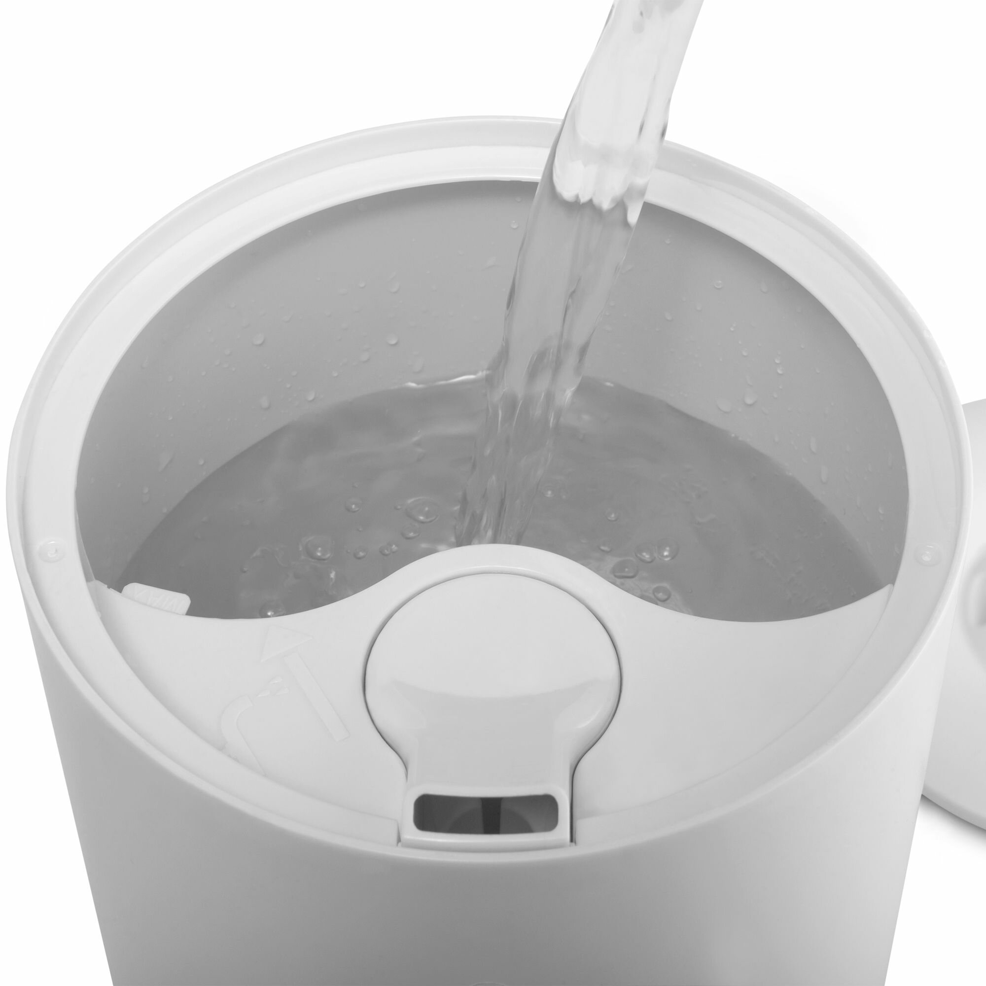 Есть ночной режим -- когда не горит индикатор. Удобно заливать -- можно не носить бак в ванную, просто придти в комнату с емкостью. Белый минималистичный дизайн. Пластик хороший. Не пахнет, приятный на ощупь. |