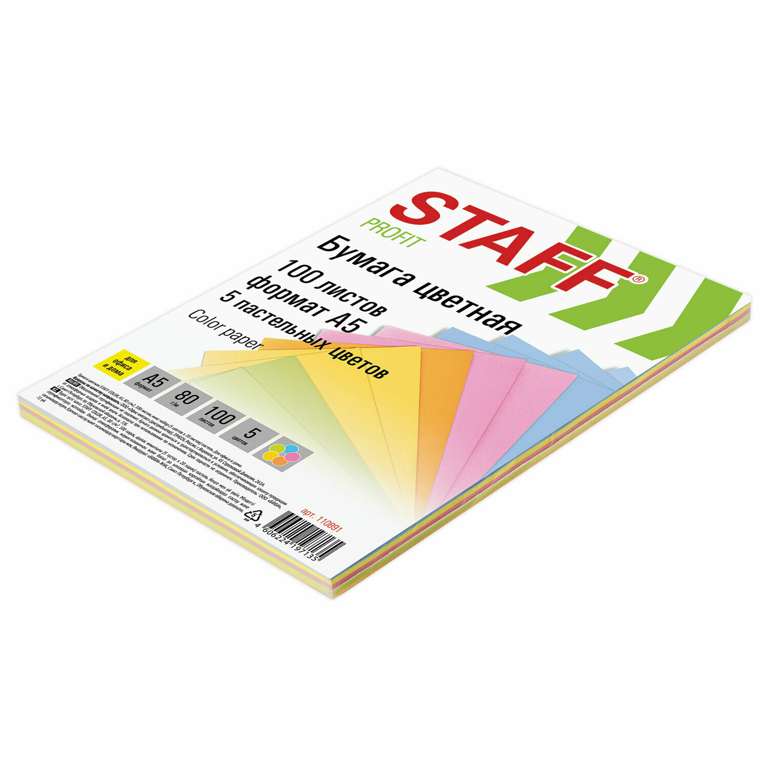 Бумага цветная STAFF "Profit" малого формата (148х210 мм), А5, 80 г/м2, 100 л. (5цв. х 20 л.), цветная пастель, для офиса и дома, 110891