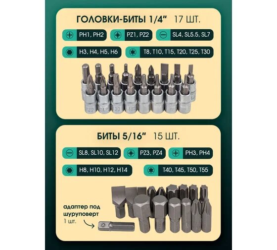 | Плюсы: | Большой комплект разных ключей, головок и всяких бит. |