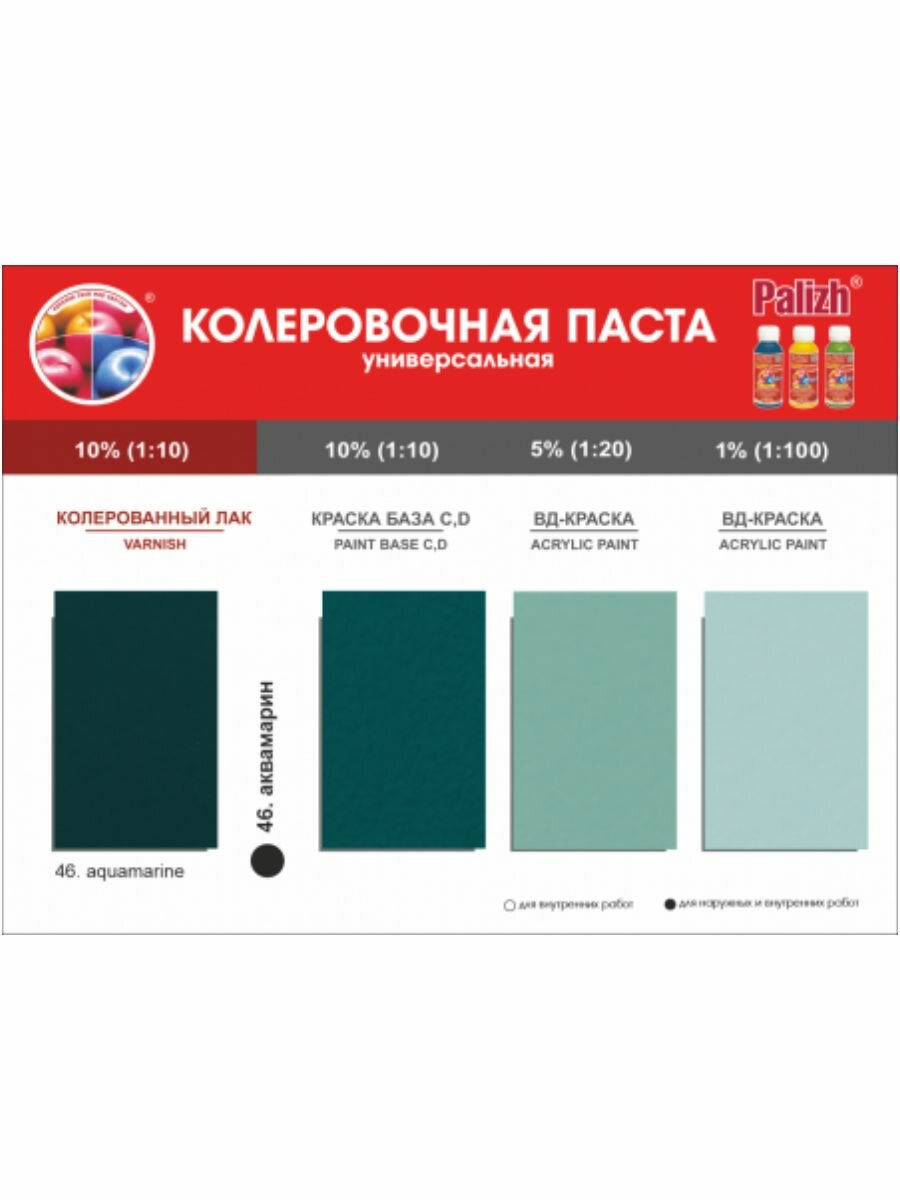Ниже Вы можете прочитать отзывы на Колер для краски "Palizh STANDART" 0,1л №46 аквамарин, ознакомится с подробными характеристиками, посмотреть интересные обзоры и фотографии на Колер для краски "Palizh STANDART" 0,1л №46 аквамарин.