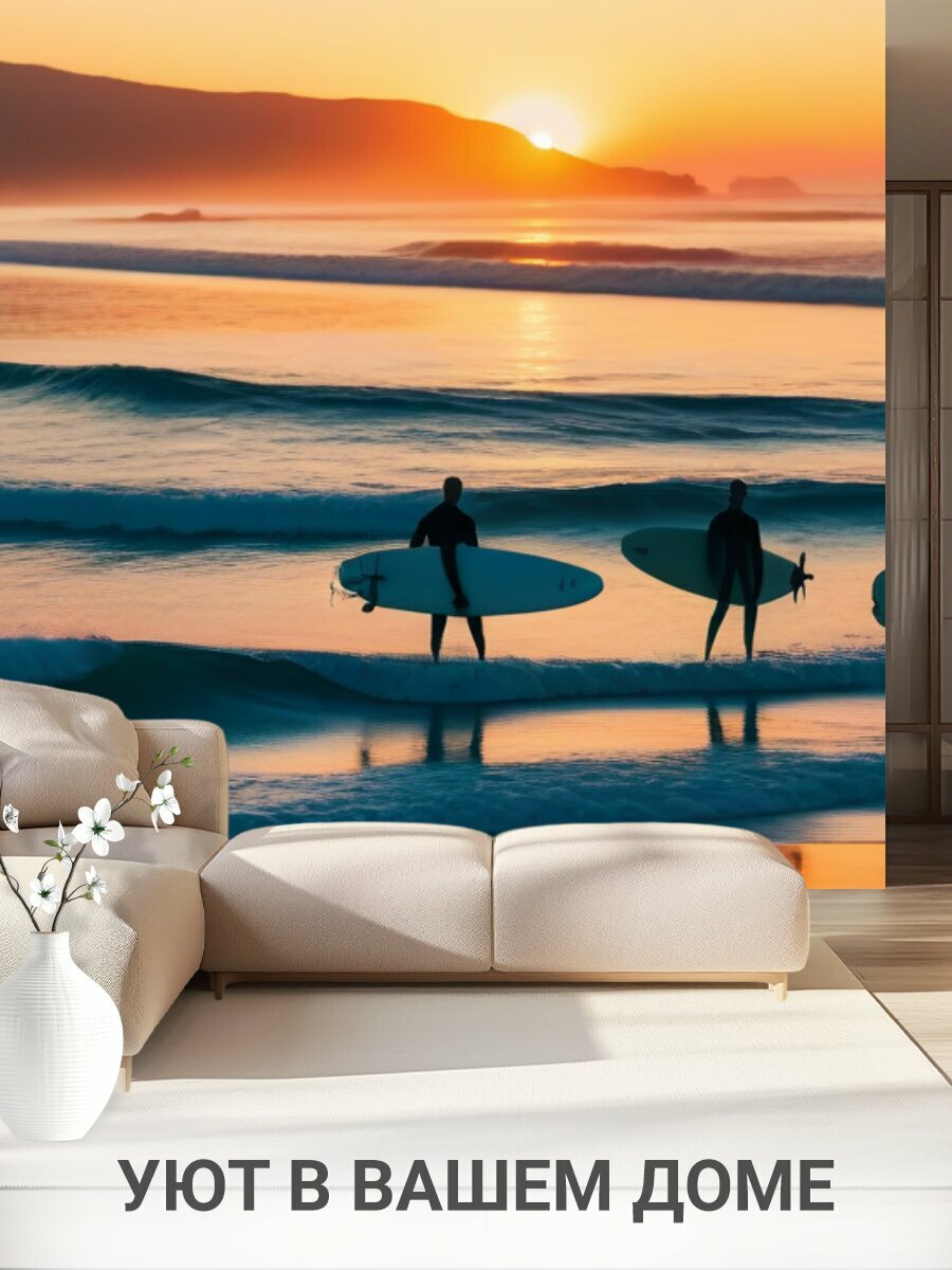 Фотообои моющиеся ударопрочные "Групповая фотография с серфингистами на фоне заката" 400x300 см. флизелиновые на стену