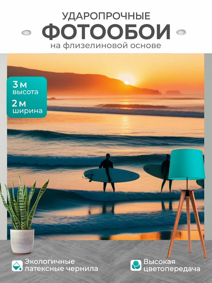 Фотообои моющиеся ударопрочные "Групповая фотография с серфингистами на фоне заката" 300x300 см. флизелиновые на стену интересное: