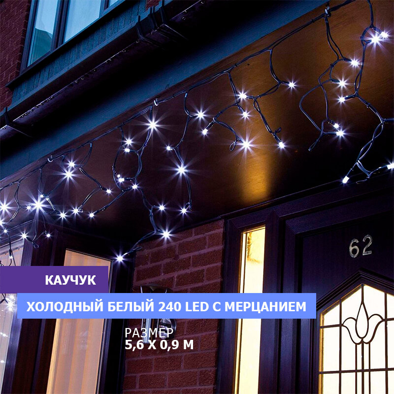Гирлянда Айсикл Бахрома светодиодная, 5,6 х 0,9 м, с эффектом мерцания,черный провод каучук, 220В, диоды белые, 240 LED
