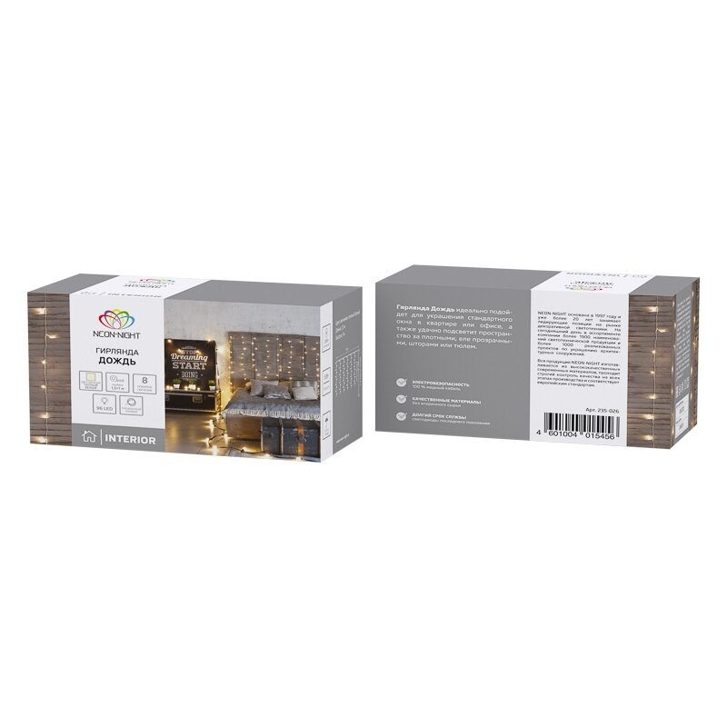 Светодиодная гирлянда NEON-NIGHT "Дождь" 1.5х1 м, 8 режимов, 96 тепло-белых светодиодов, прозрачный провод