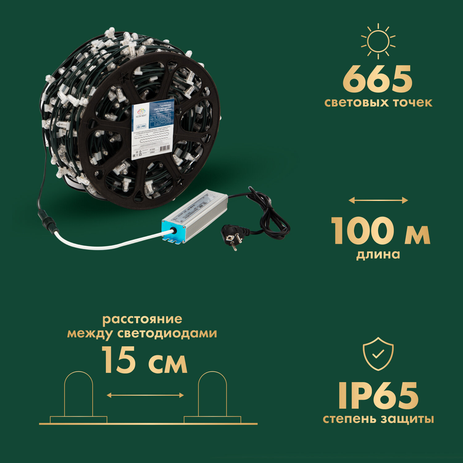 Светодиодная гирлянда Клип-Лайт Neon-night бухта 100 метров, 660 тепло-белых светодиодов с шагом 15 см, тёмно-зелёный провод