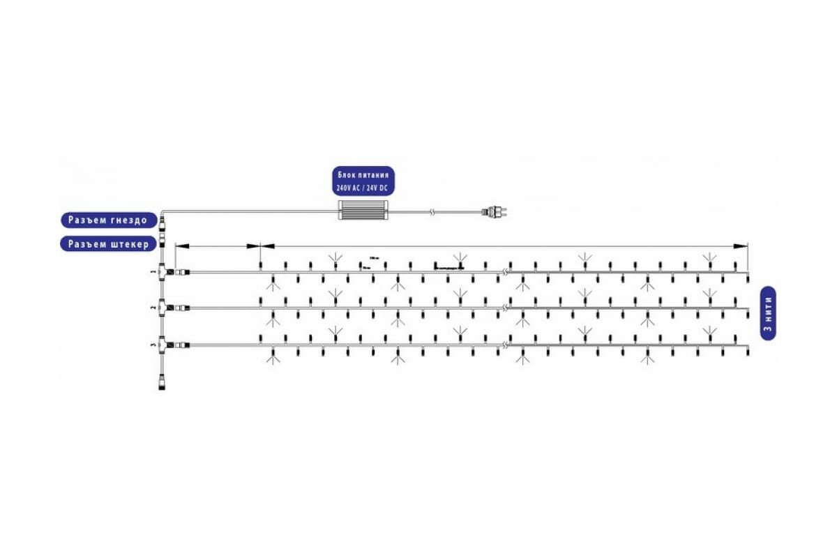 СохранитьГирлянда светодиодная Нить уличная, 24V, 3 нити по 20 м, цвет диодов Синий, новогодние товары подарки/ электрогирлянда Neon-Night интересное: