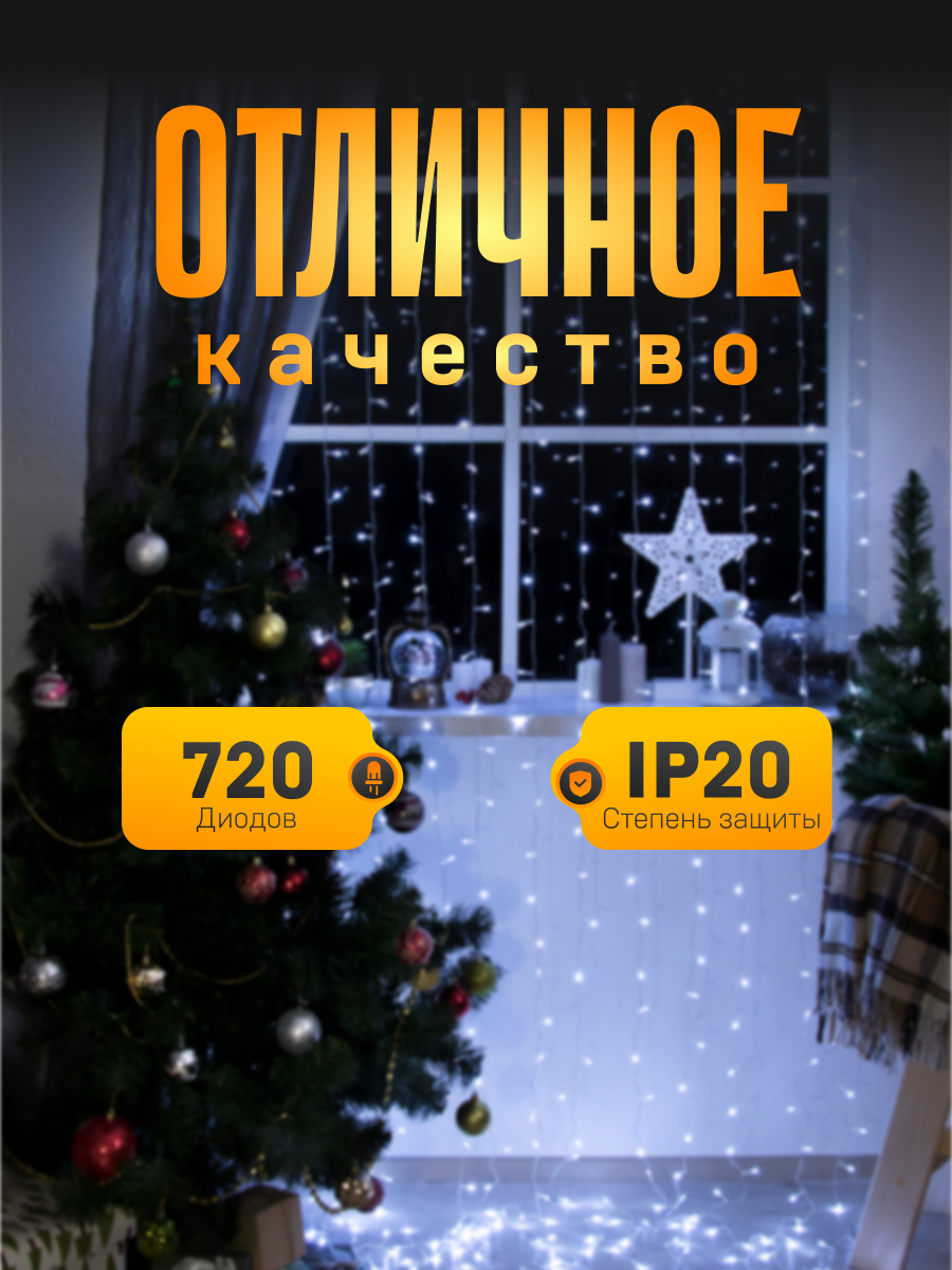 СохранитьГирлянда Занавес 2 х 3 м, IP20, прозрачная нить, 720 LED, свечение белое, 8 режимов, 220 В интересное: