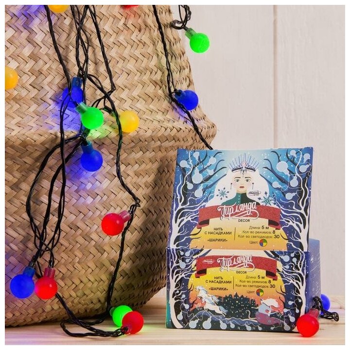 Гирлянда Luazon Lighting Нить с насадками “Шарики Цветные”, 5 м, LED-30-220V, 8 режимов, нить прозрачная, свечение мульти (3590698)