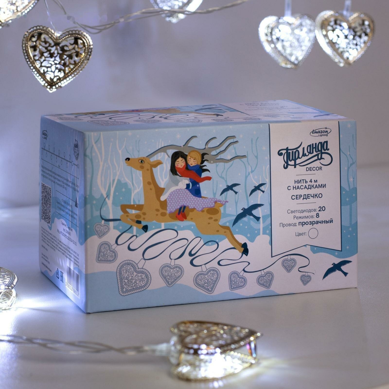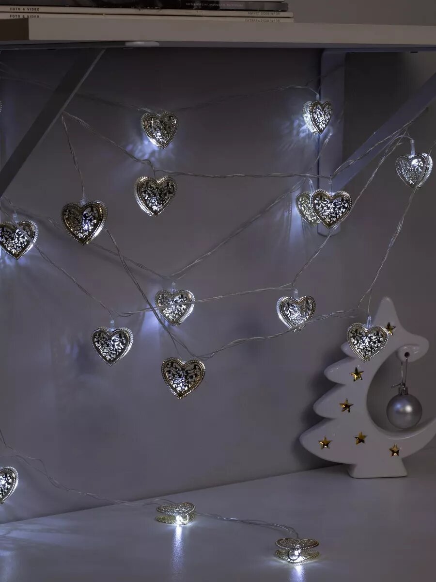 Купить Гирлянда «Нить» 4 м с насадками «Сердечко», IP20, прозрачная нить, 20 LED, свечение белое, 8 режимов, 220 В