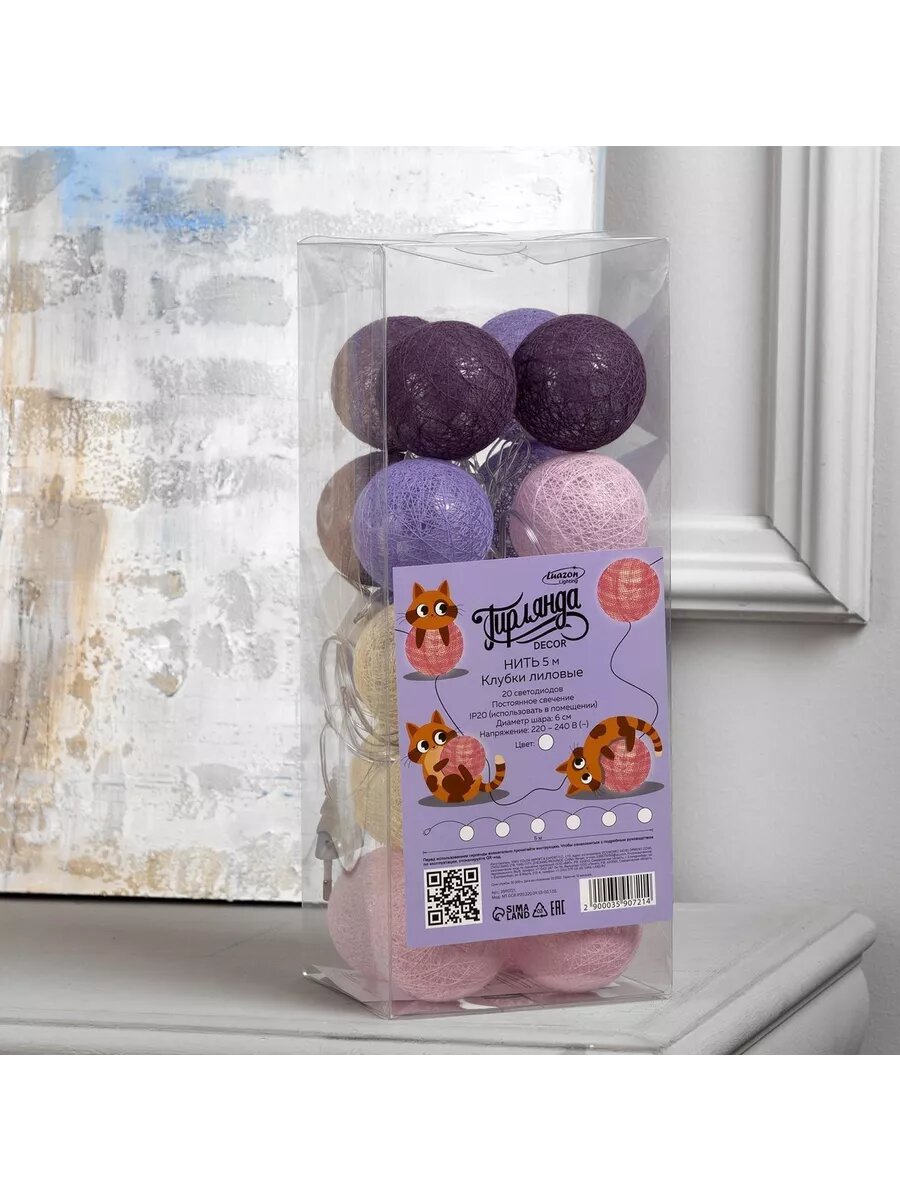 Купить Гирлянда «Нить» 5 м с насадками «Клубки лиловые», IP20, прозрачная нить, 20 LED, свечение белое, 220 В
