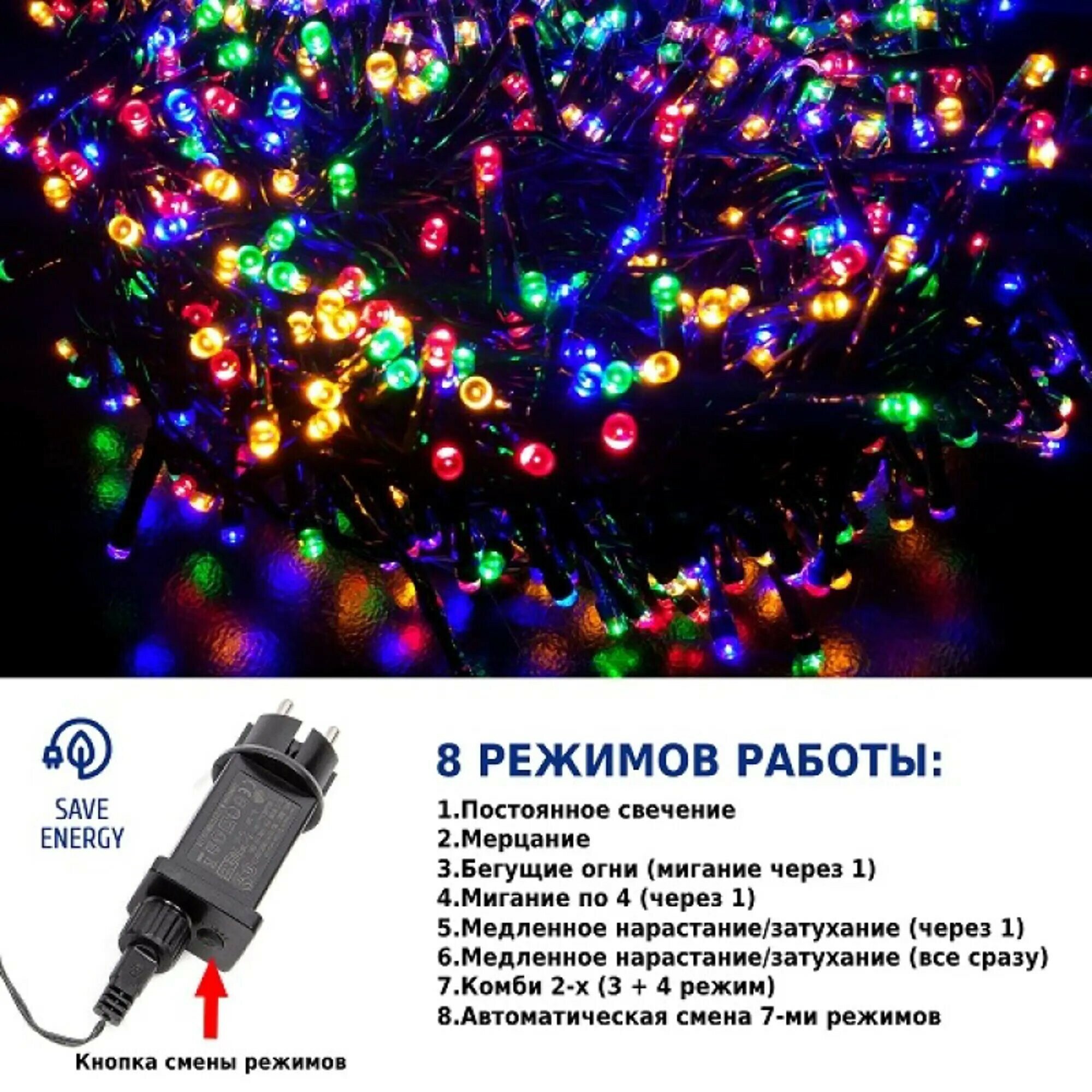 | Плюсы: | Часто посаженные лампочки, яркий свет, разноцветные, много режимов, длина |