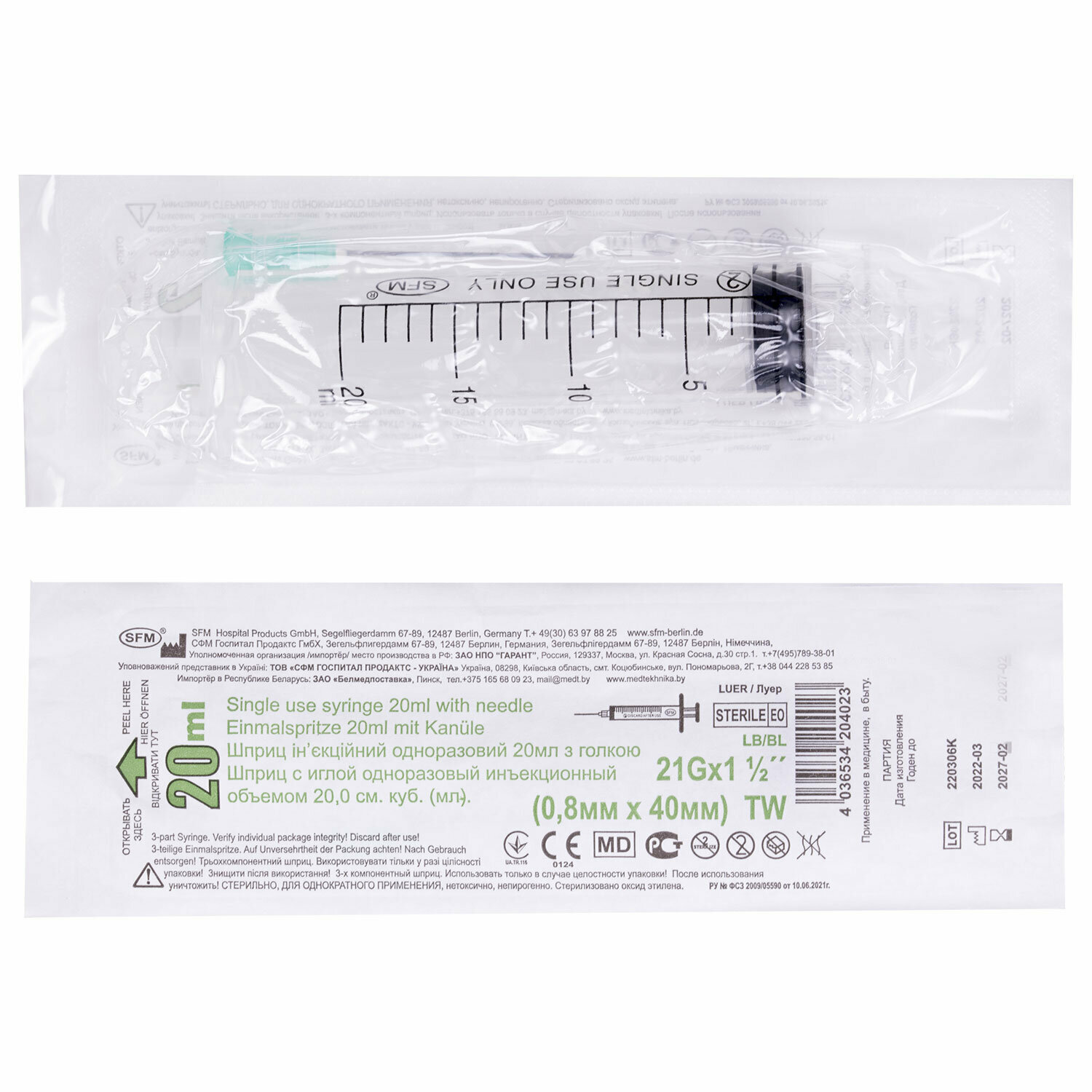 Шприц "SFM" 20 мл трехкомпонентный, одноразовый, стерильный с иглой 21G 1 ½ (0,80х40 мм) (50 шт)