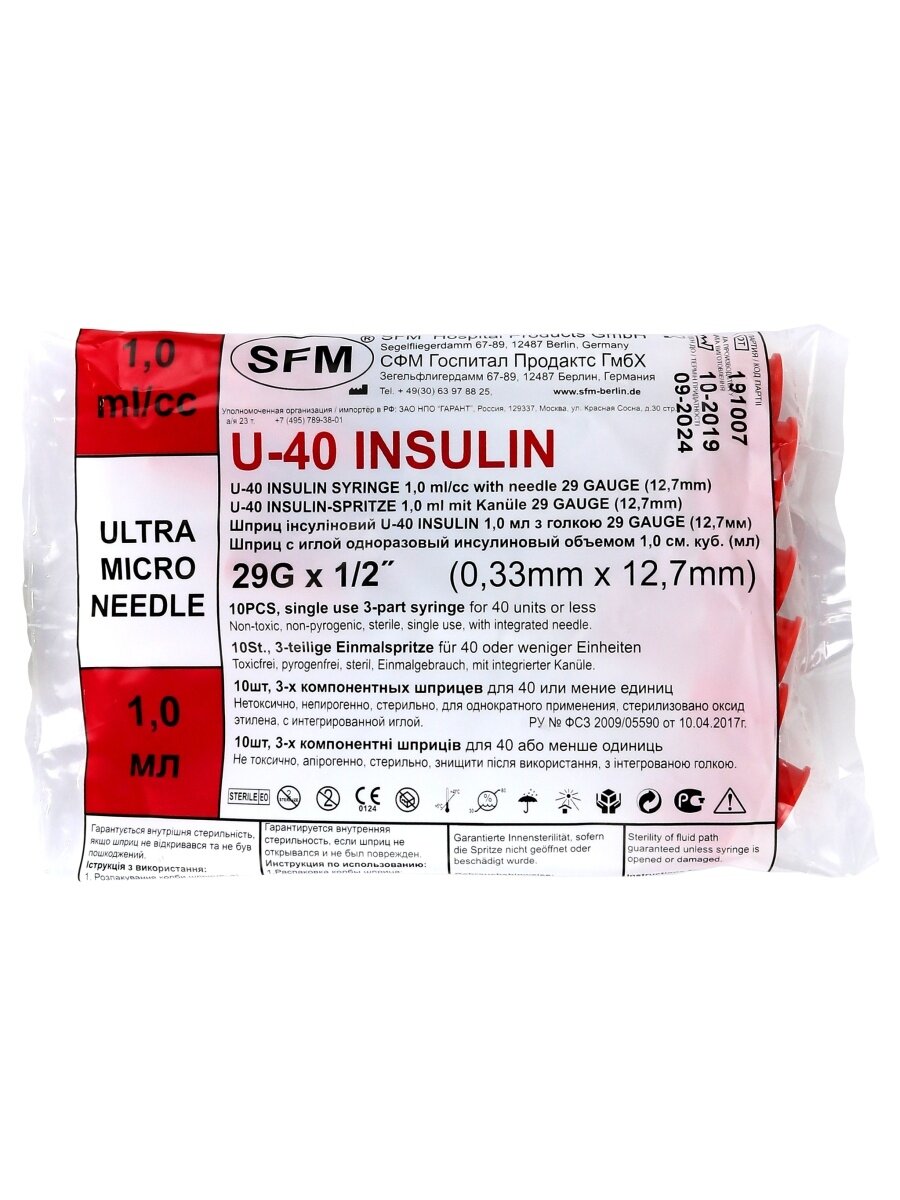 Шприц инсулиновый SFM, 1 мл, комплект 10 шт., в пакете, U-40 игла несъемная 0,33х12,7 мм - 29G, 534251 Комплект : 10 шт .