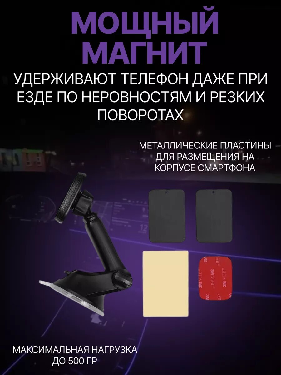 Очень хороший, крепкий магнит. Без особых усилий, с помощью присоски, крепится на приборную панель. Сам магнит для удержания крутится на 360'; есть регулировка угла наклона и длинны, которой более чем хватает.