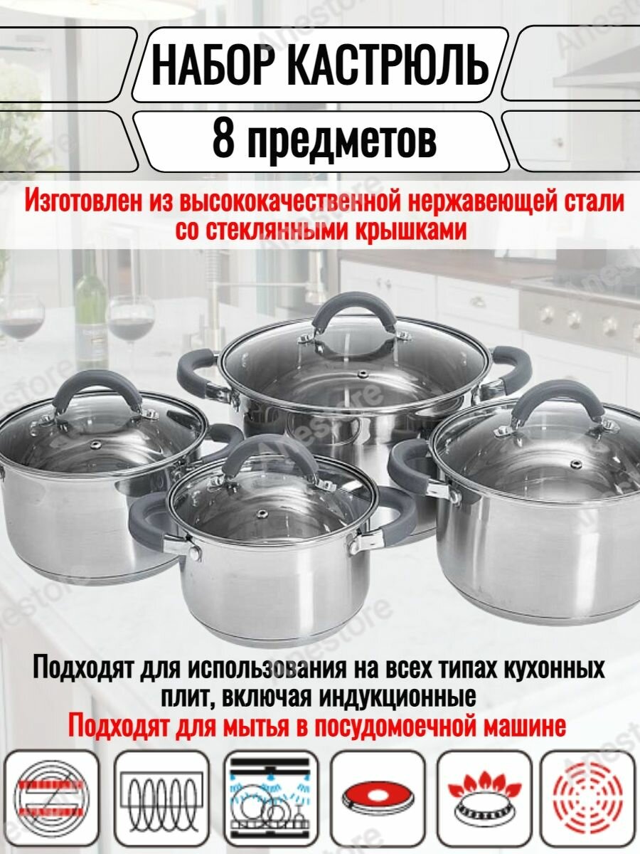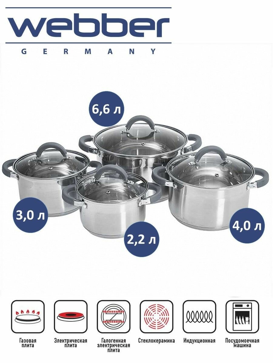 Купить WEBBER BE-626/8 Набор посуды из нерж.стали 8 пр. 2,2л, 3,0л, 4,0л, 6,6л со стеклянными крышками