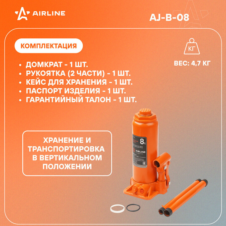 Домкрат гидравлический AIRLINE AJ-B-08 бутылочный, 8т