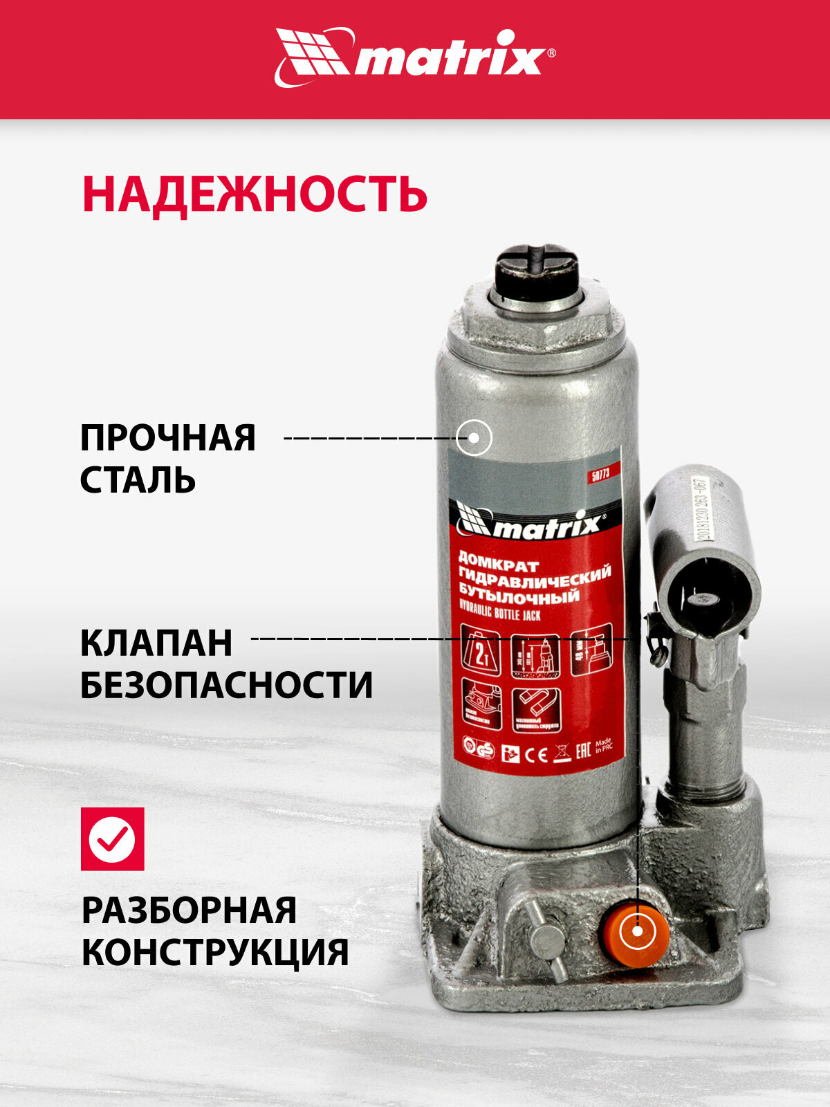 MATRIX Домкрат гидравлический бутылочный 2 т MATRIX 50773