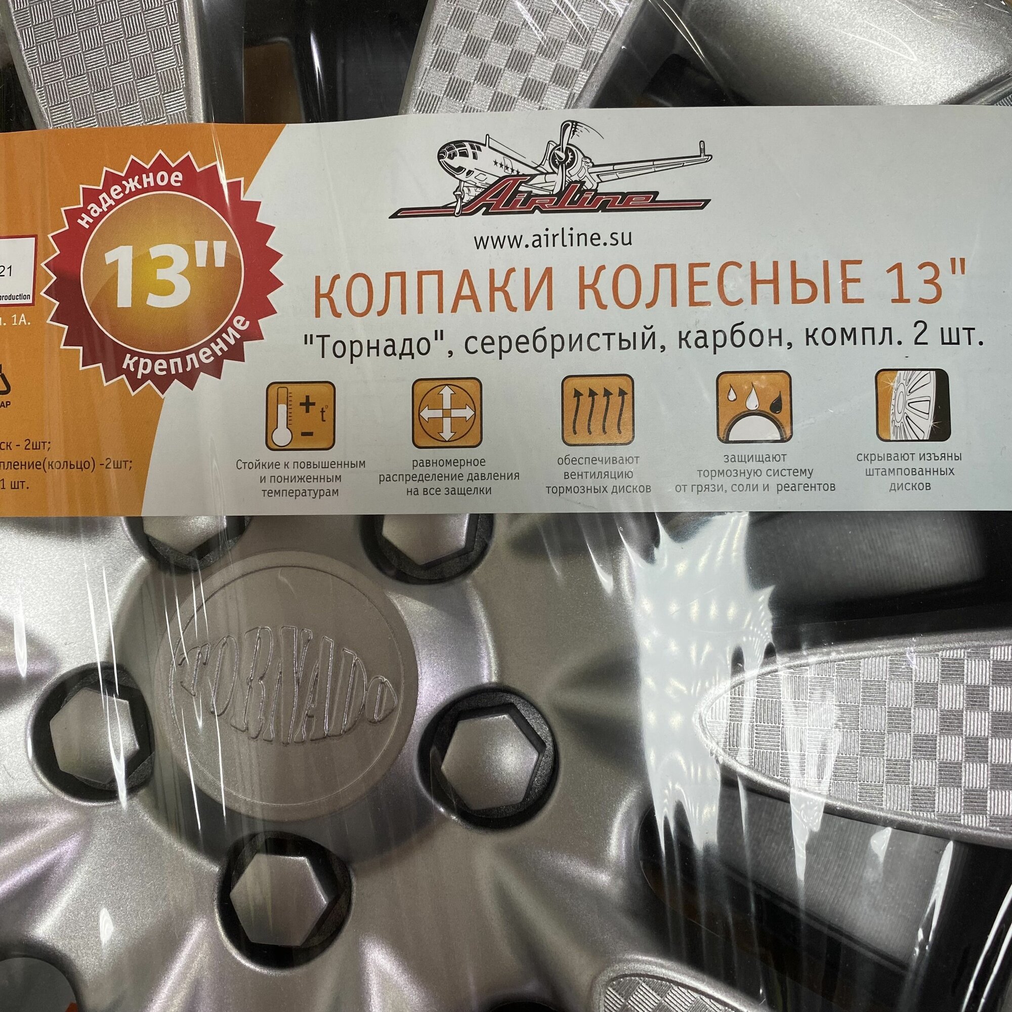 Колпак Колесный 2 Шт, 13 Дюймов, Торнадо Т, Серебристый/Черный, Карбон, Для Защиты Колесных Штампованных Дисков AIRLINE арт. ...