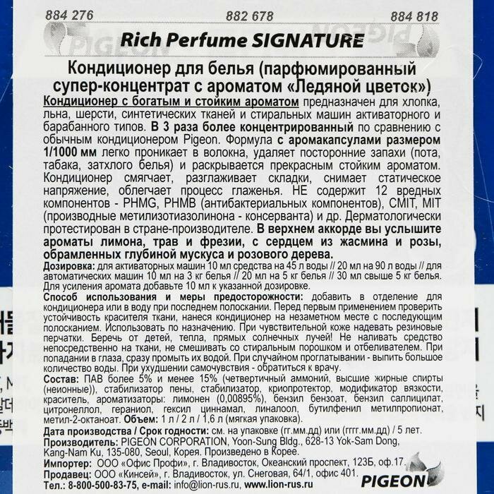 Pigeon rich perfume signature кондиционер для белья парфюмированный супер-концентрат с ароматом ледяной цветок, 1 л