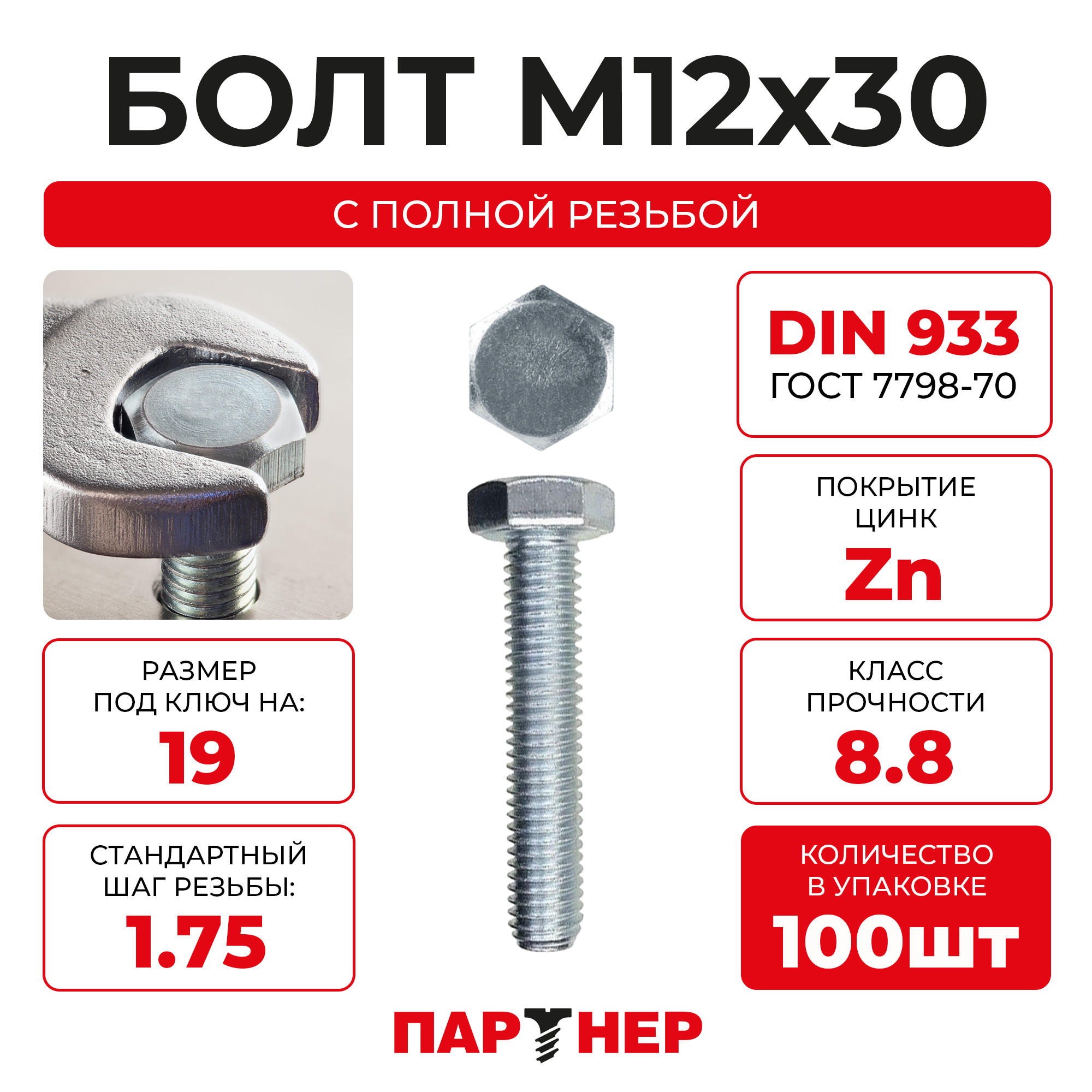 DIN933 М12х30 Болт с шестигранной головой, полная резьба 8,8 ZN (100шт.), в контейнере