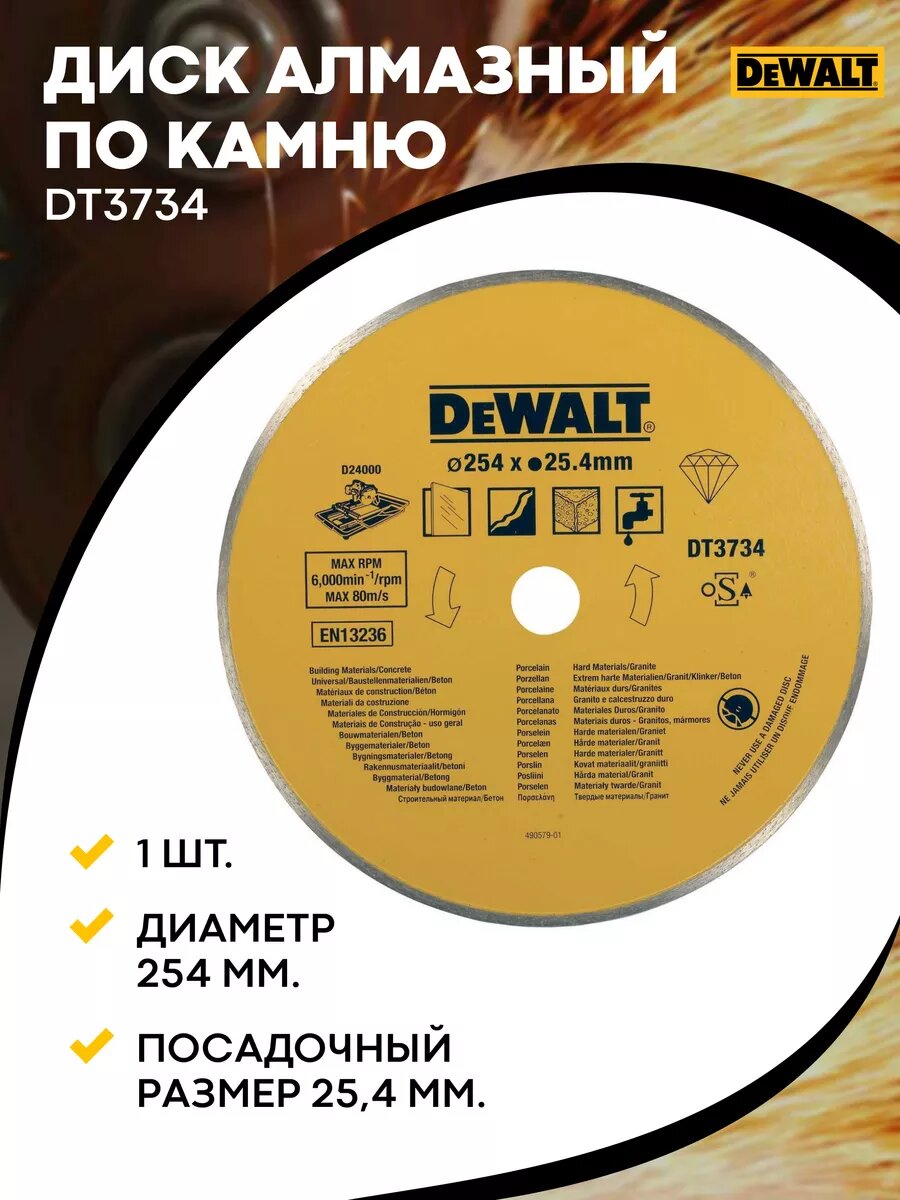 Диск алмазный по камню DEWALT DT3734, (254 x 25.4 мм) для плиткореза D24000