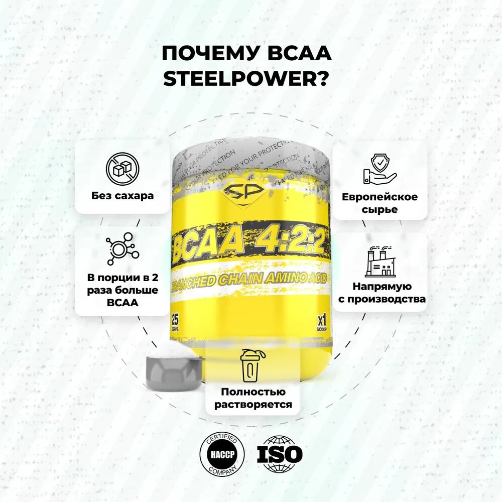 Купить Аминокислоты БЦАА STEEL POWER BCAA 4:2:2, Без вкуса, 200 г (25 порций)