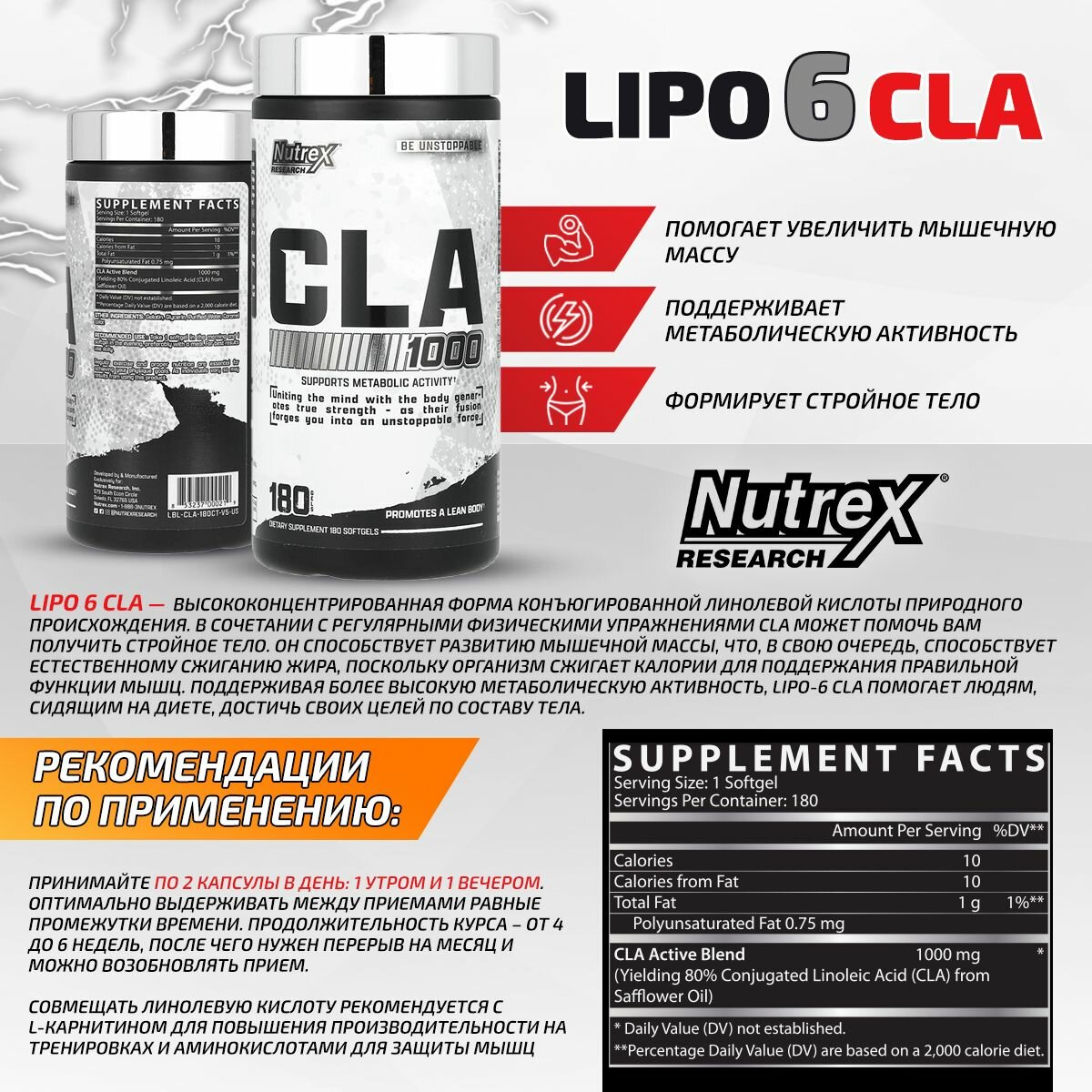 Nutrex Lipo 6 CLA, Конъюгированная линолевая кислота, Омега-6, 180 капсул, Спортивное питание, жиросжигатель для похудения и поддержания мышечной массы