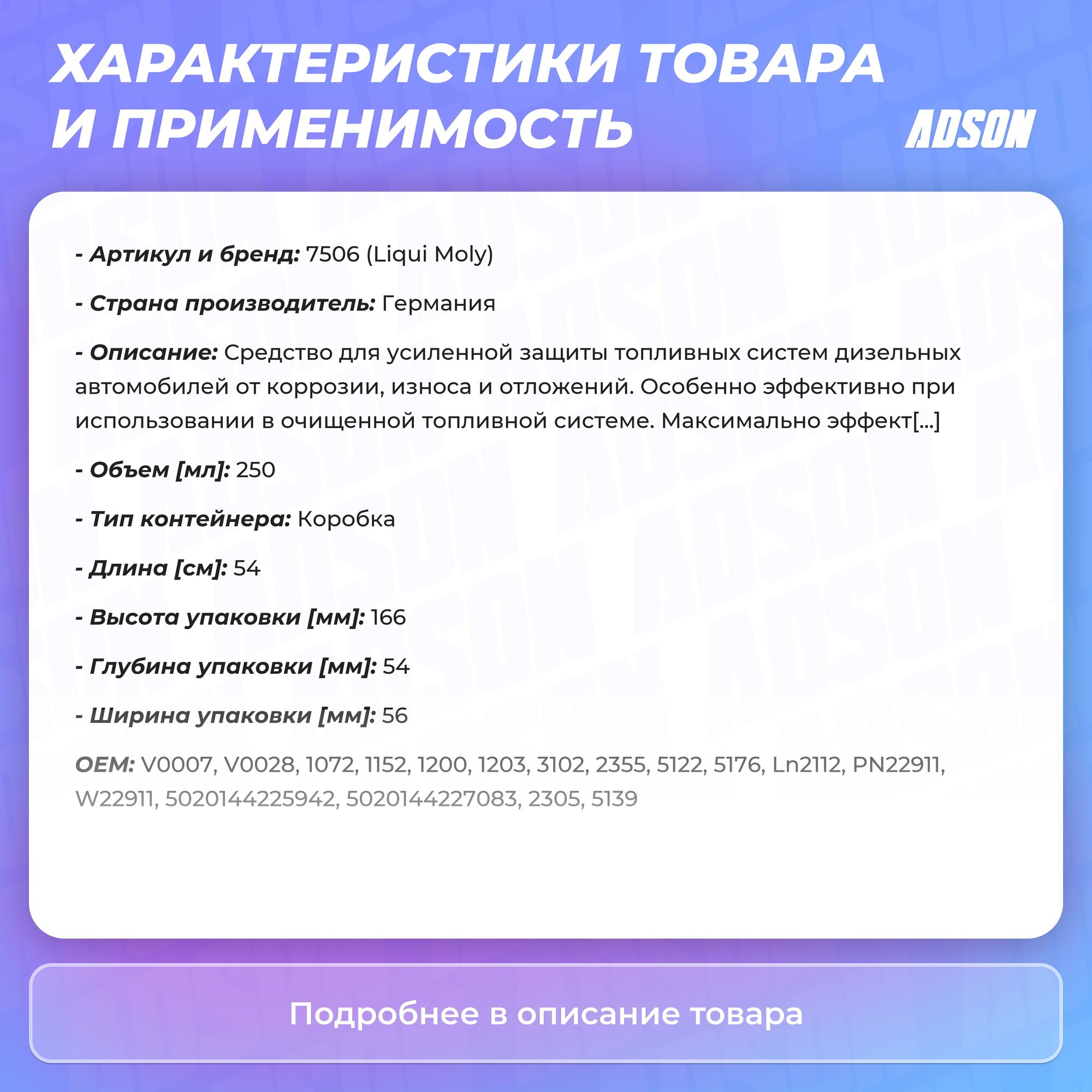 Присадка В Дизельное Топливо Для Защиты Диз. Системы Liqui Moly Diesel Systempflege, 0.25Л 7506 Liqui Moly Арт. 7506 Liqui mo...