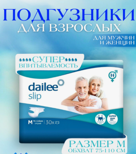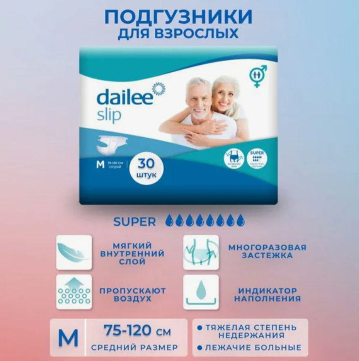 Подгузники для взрослых Dailee Super (Дейли Супер) - M (Medium), объем талии 75-110 см, 8 капель, дневные и ночные, 30 штук