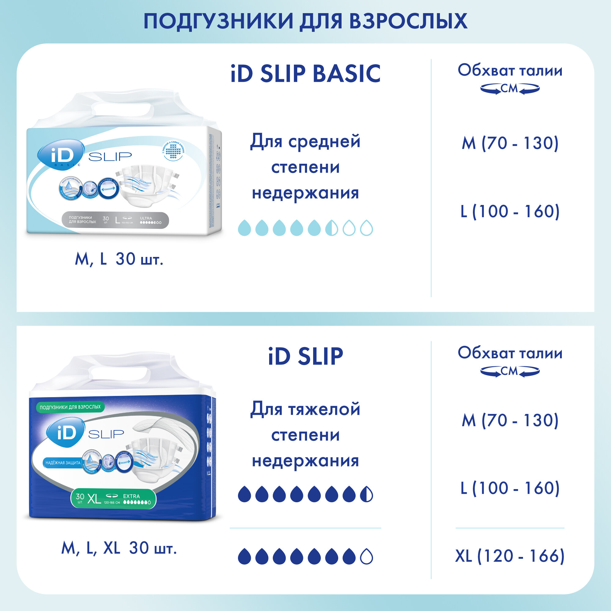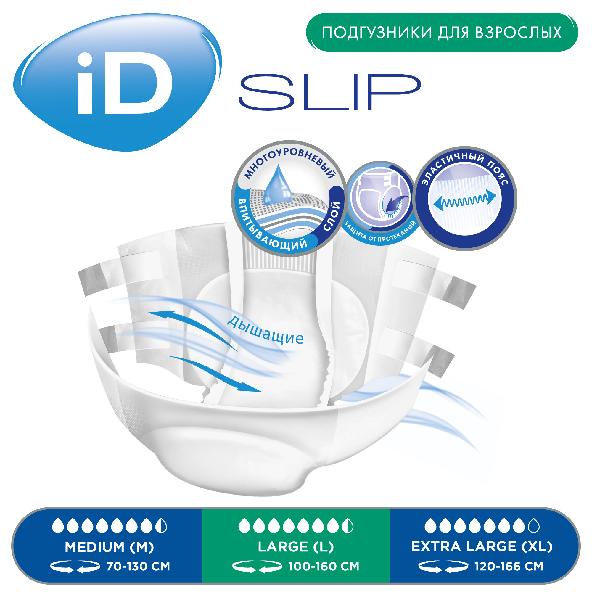 Подгузники для взрослых iD Slip Medium, объем талии 70-120 см, 30 шт.
